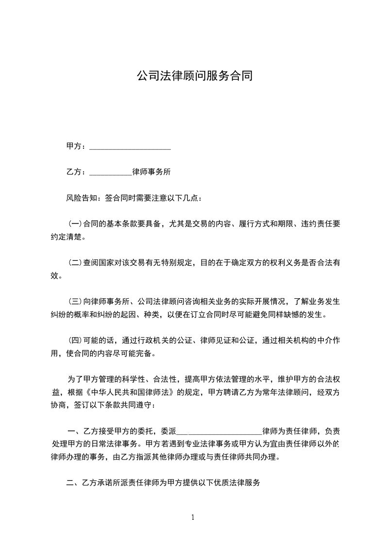 一、乙方接受甲方的委托,委派______________________律师为责任律师,负责处理甲方的日常法律事务。甲方若遇到专业法律事务或甲方认为宜由责任律师以外的律师办理的事务,由乙方指派其他律师办理或与责任律师共同办理。