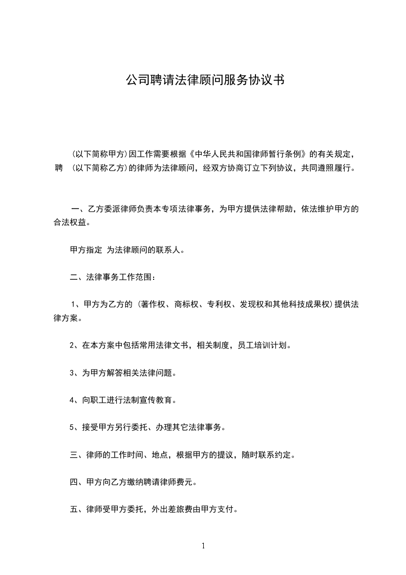 1。乙方实行定期与不定期相结合的法律服务制度,根据甲方需要,乙方随时提供法律服务,若甲方需乙方定期提供服务,双方另行协商;