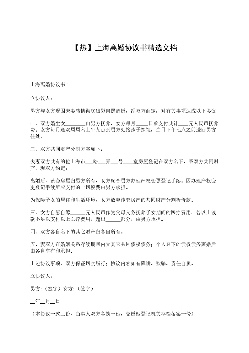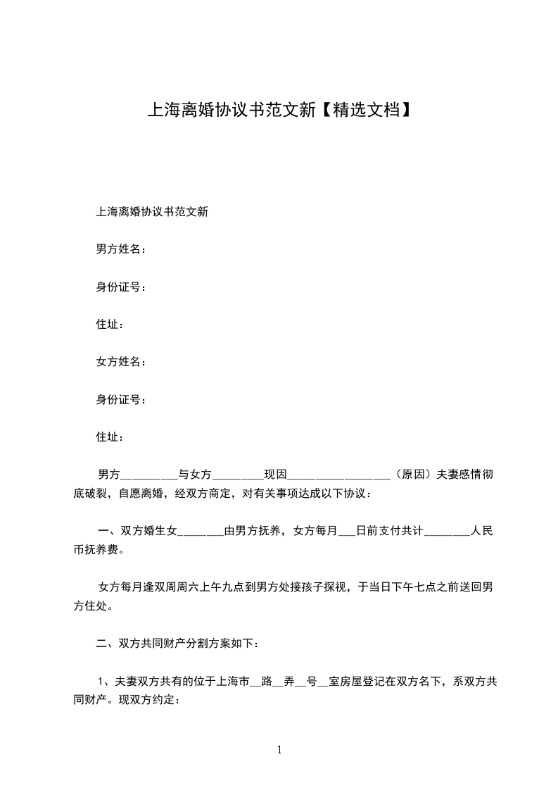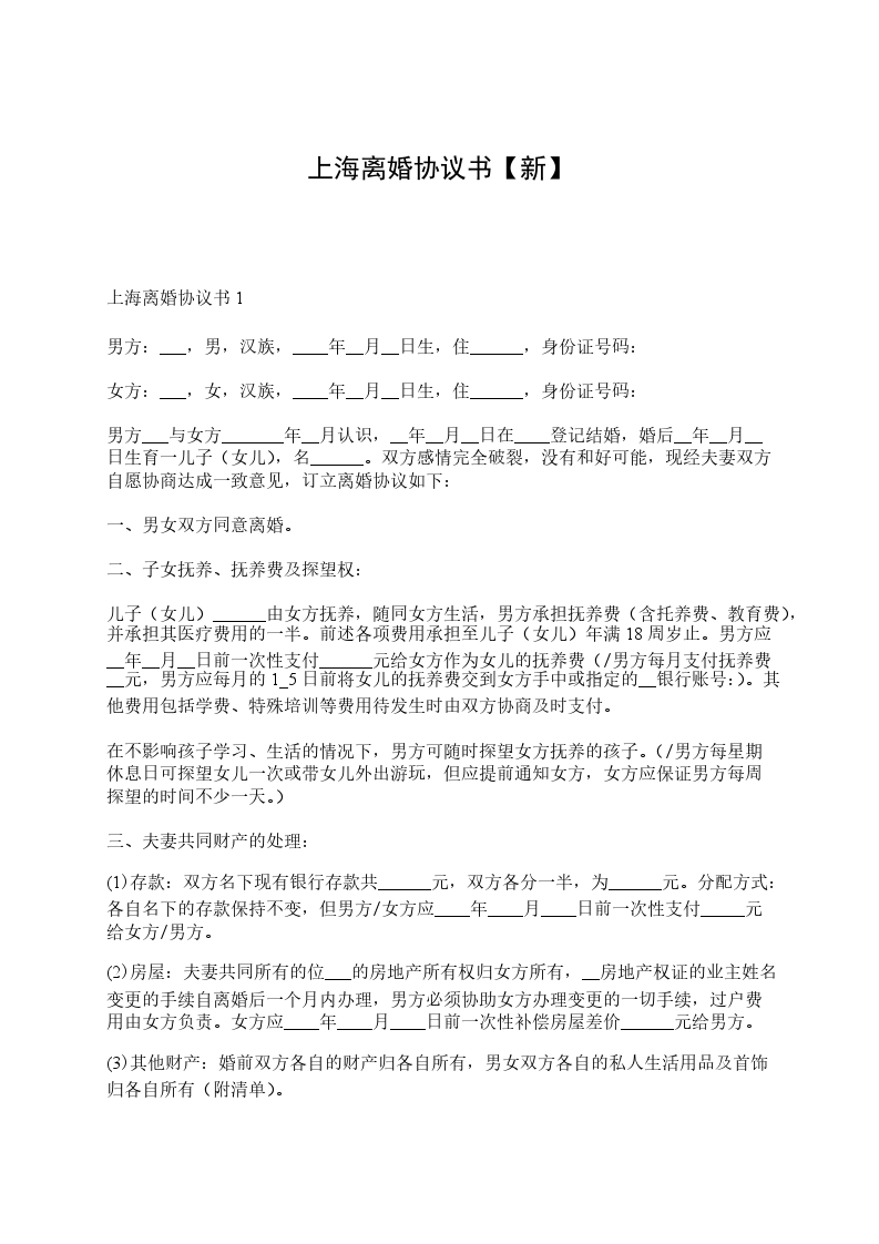 上海离婚协议书范文新