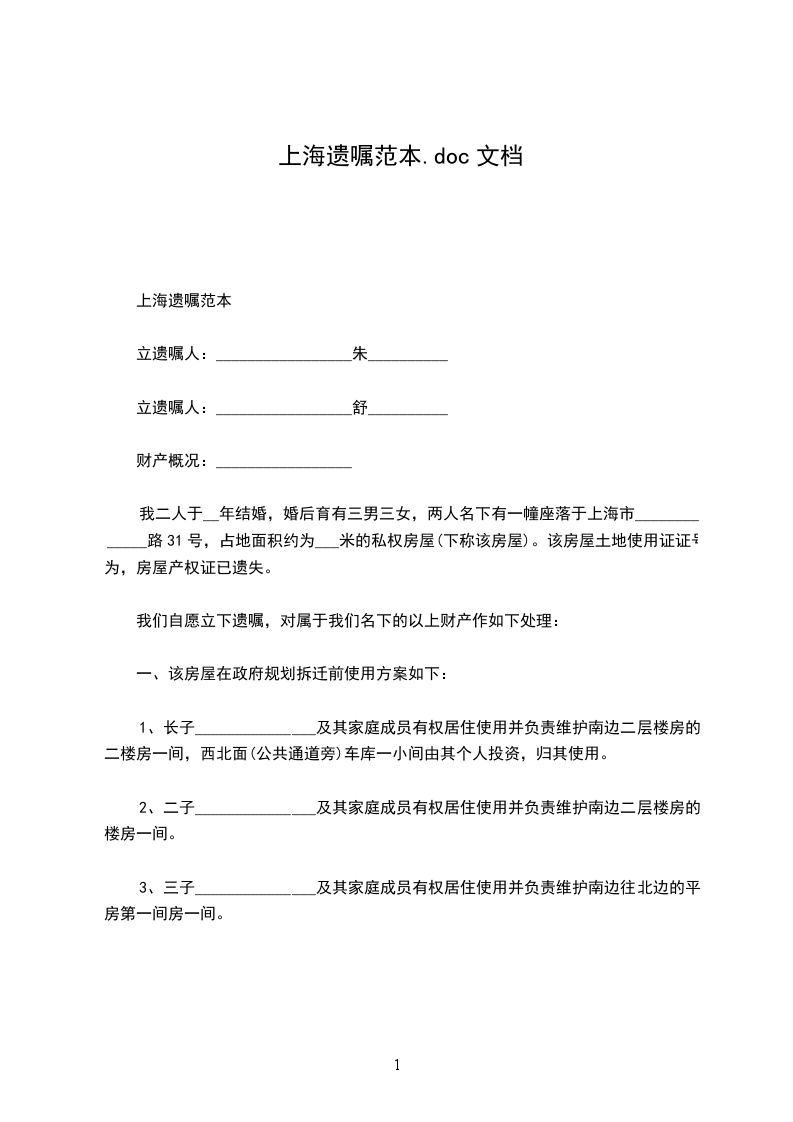 1、夫妻双方共有的位于上海市__路__弄__号__室房屋登记在双方名下,系双方共同财产。现双方约定: