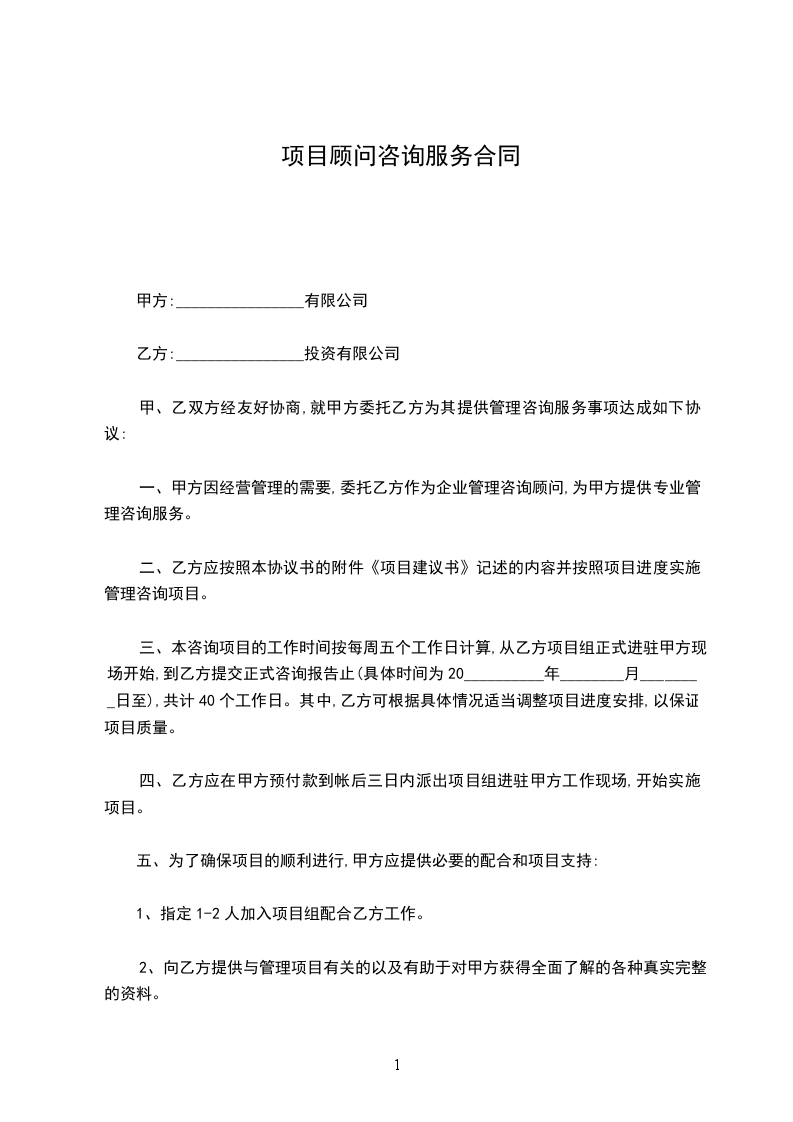 ⑴在双方签定合同后___天内,甲方支付乙方项目全程顾问咨询费预付款:人民币_________万元整(¥_________元)。