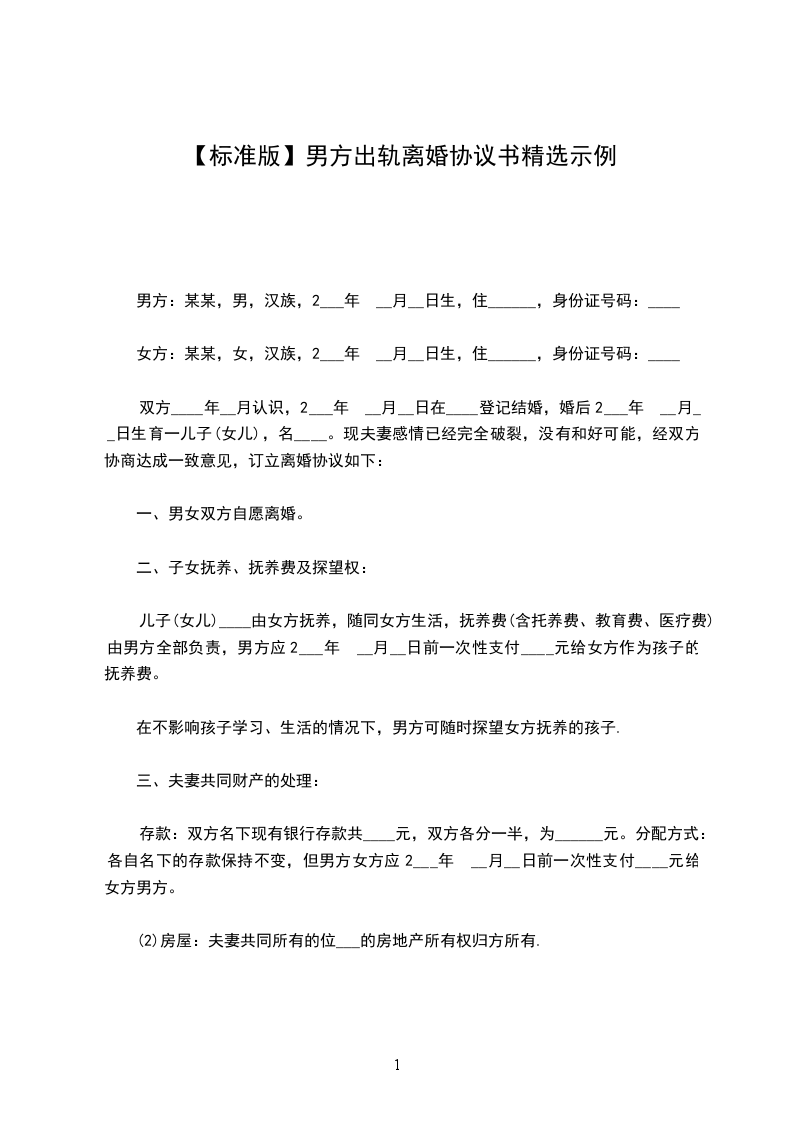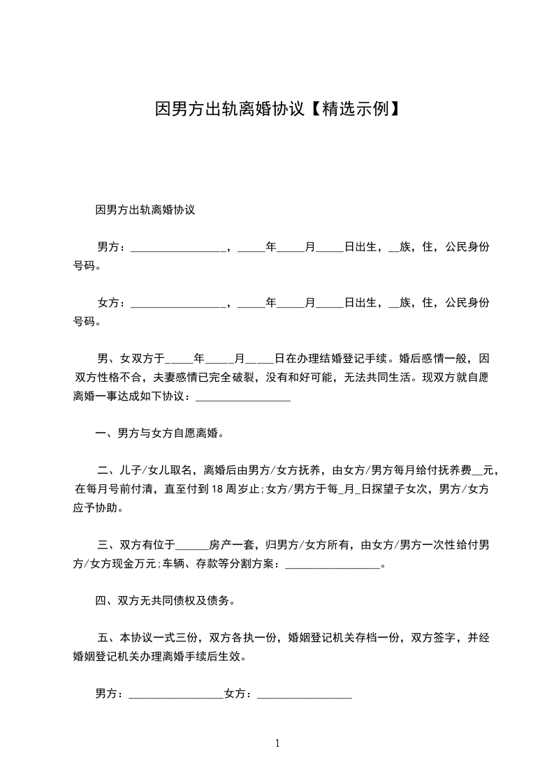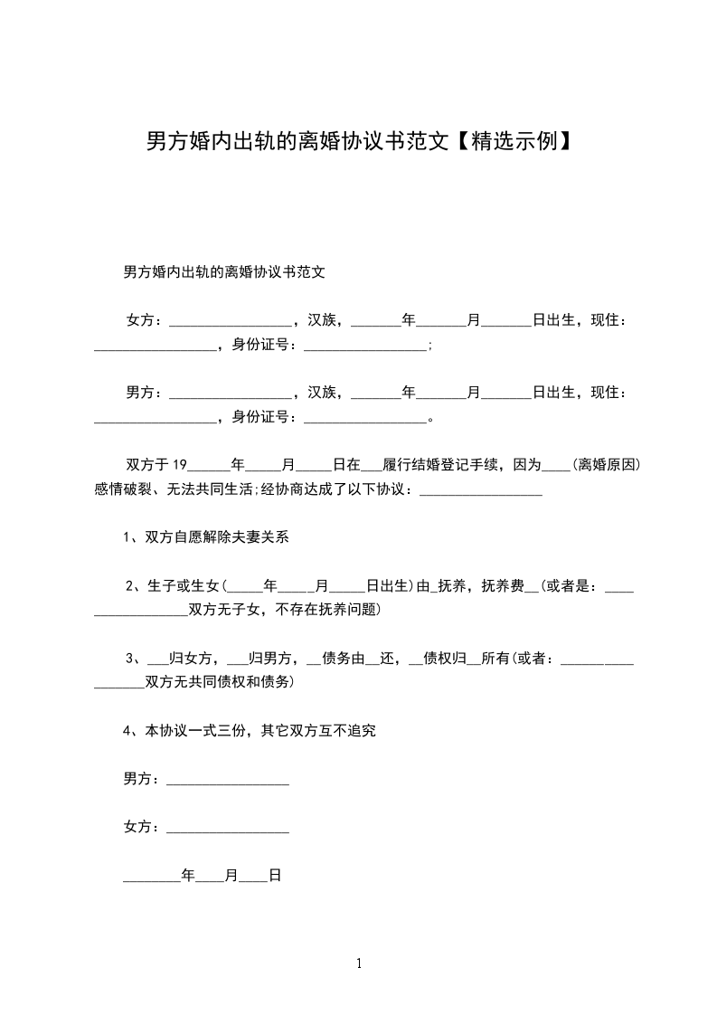 男方婚内出轨的离婚协议书范文