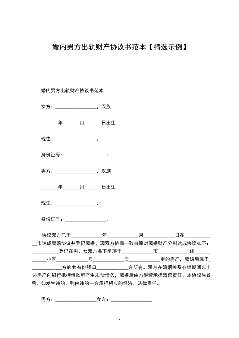 女方:_________________,汉族,_______年_______月_______日出生,现住:_________________,身份证号:_________________;