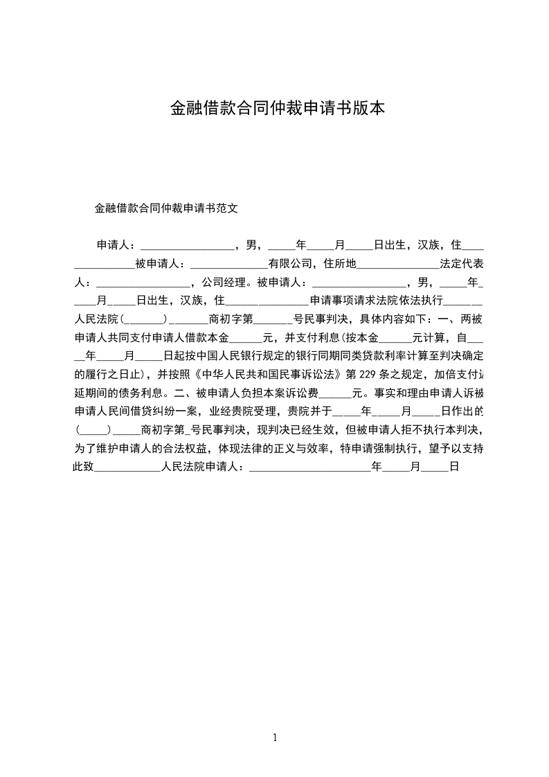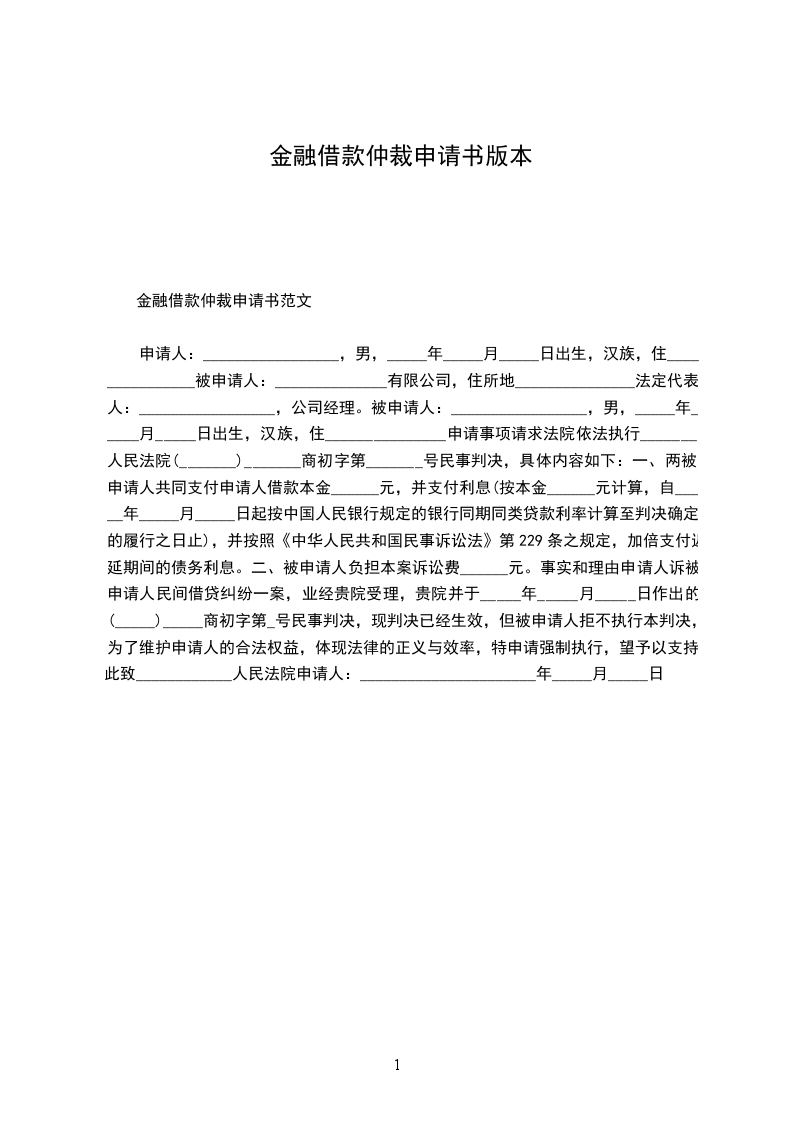 金融借款合同仲裁申请书范文