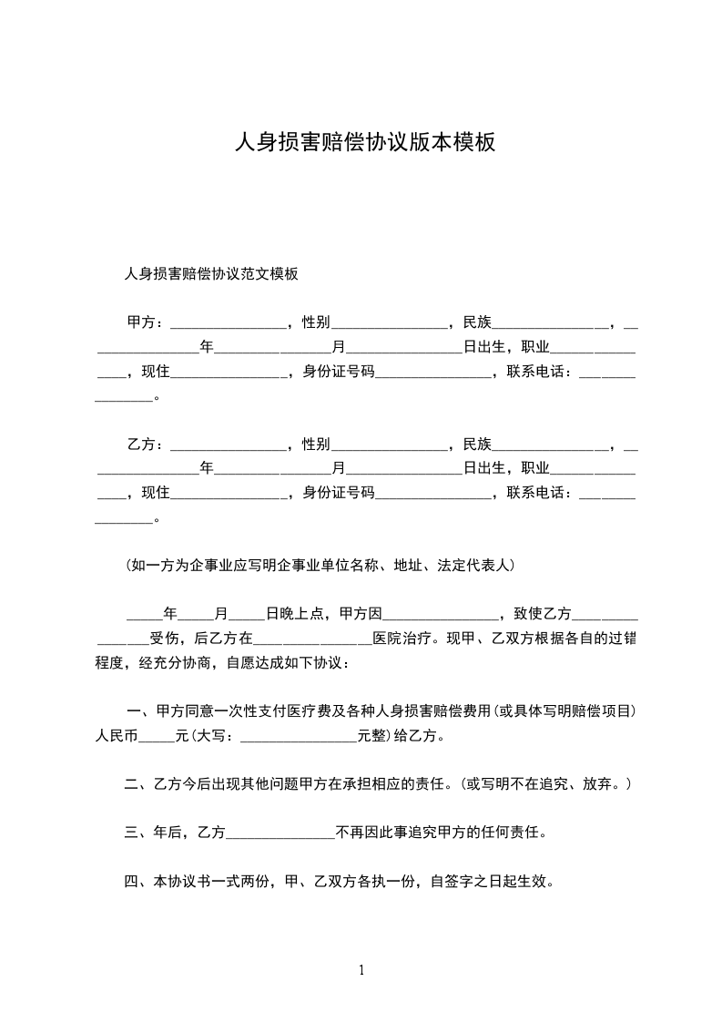 一、甲方同意一次性支付医疗费及各种人身损害赔偿费用(或具体写明赔偿项目)人民币_____元(大写:________________元整)给乙方。
