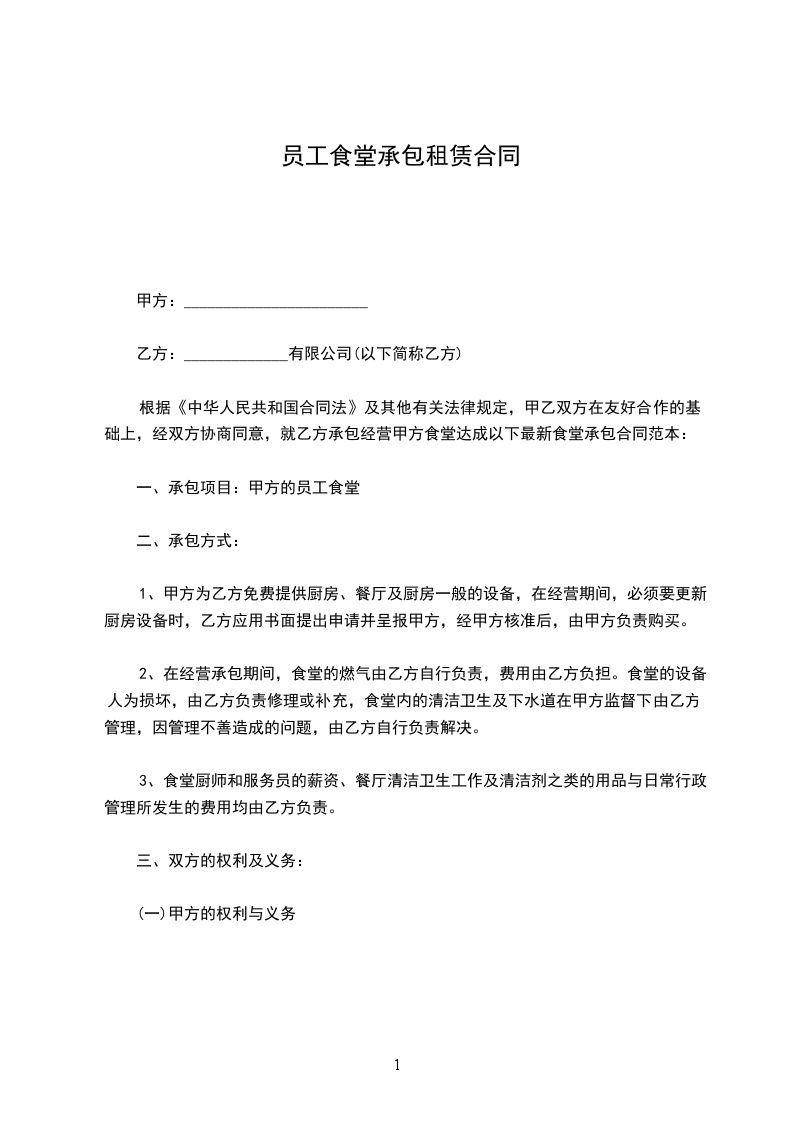 根据《中华人民共和国合同法》及其他有关法律规定,甲乙双方在友好合作的基础上,经双方协商同意,就乙方承包经营甲方食堂达成以下最新食堂承包合同范本: