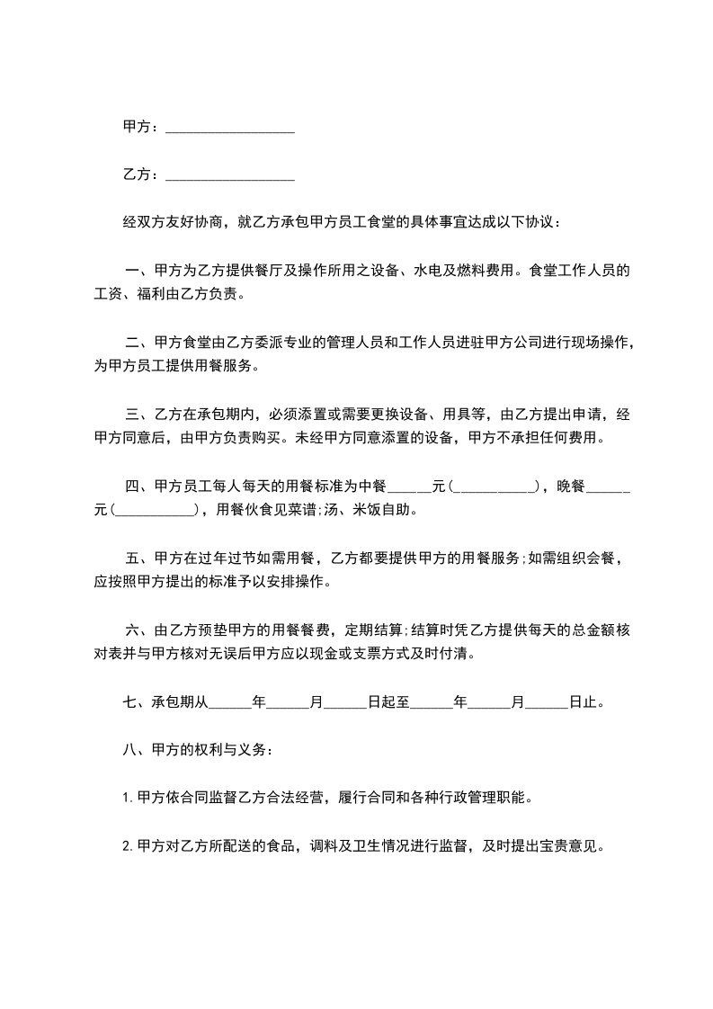 六、本最新食堂承包合同范本双方签章后生效,合同正本一式两份,甲乙双方各执一份。