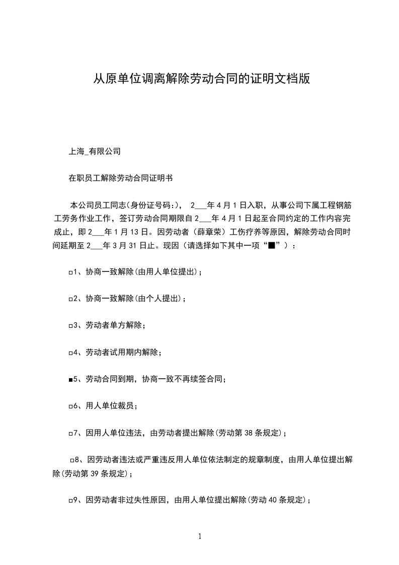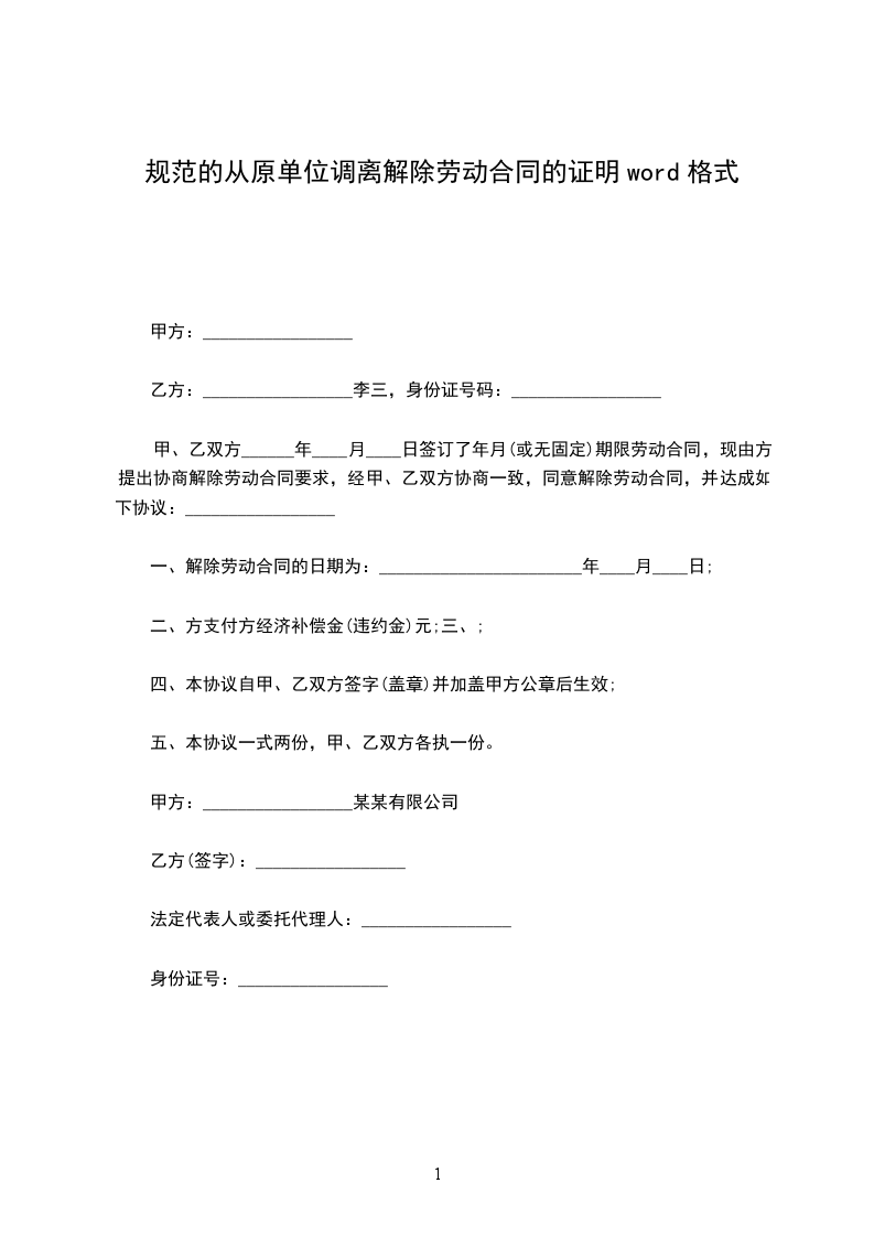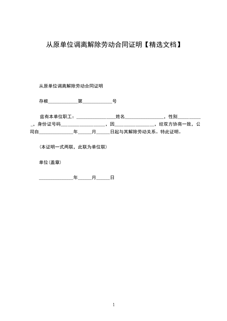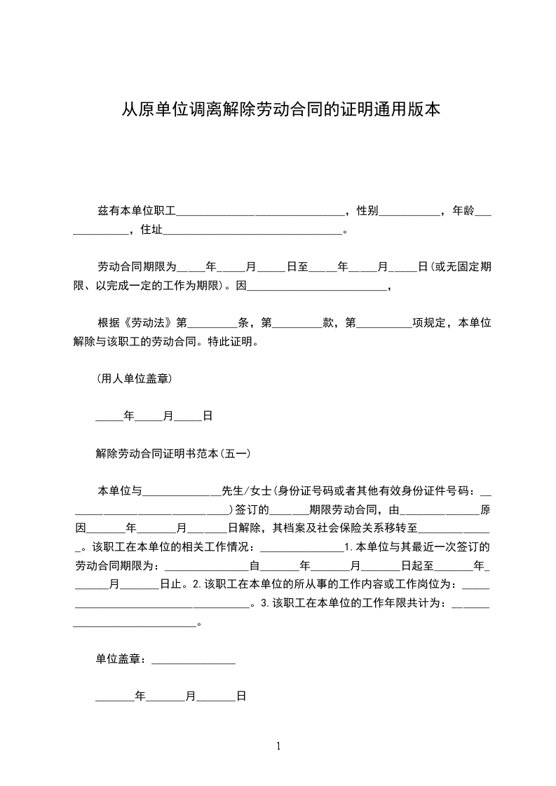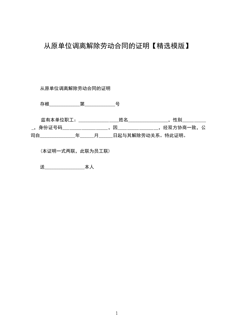 从原单位调离解除劳动合同证明