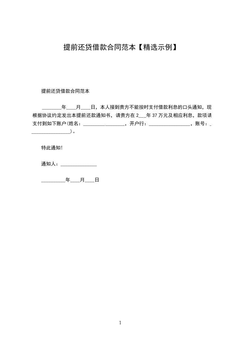 ________年____月____日,本人接到贵方不能按时支付借款利息的口头通知,现根据协议约定发出本提前还款通知书,请贵方在2___年37万元及相应利息,款项请支付到如下账户(姓名:_________________,开户行:_________________,账号:_________________)。