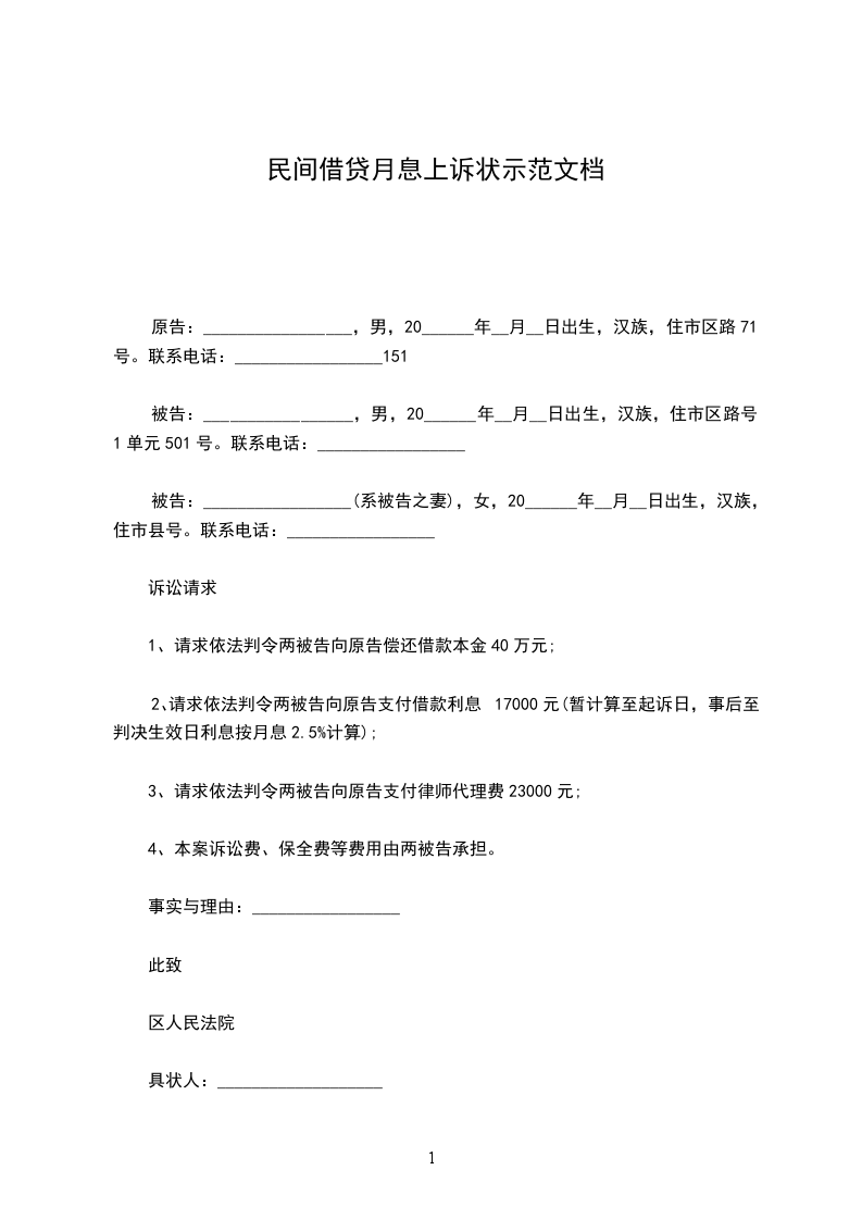 民间借贷月息上诉状