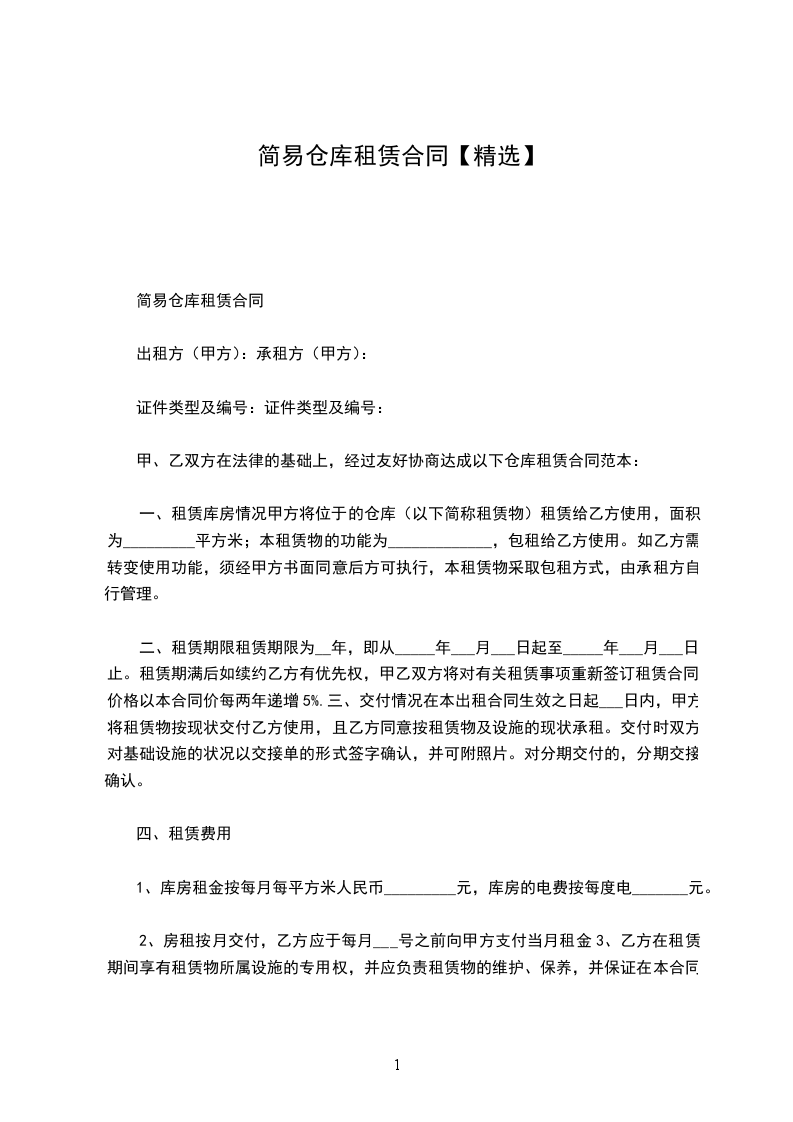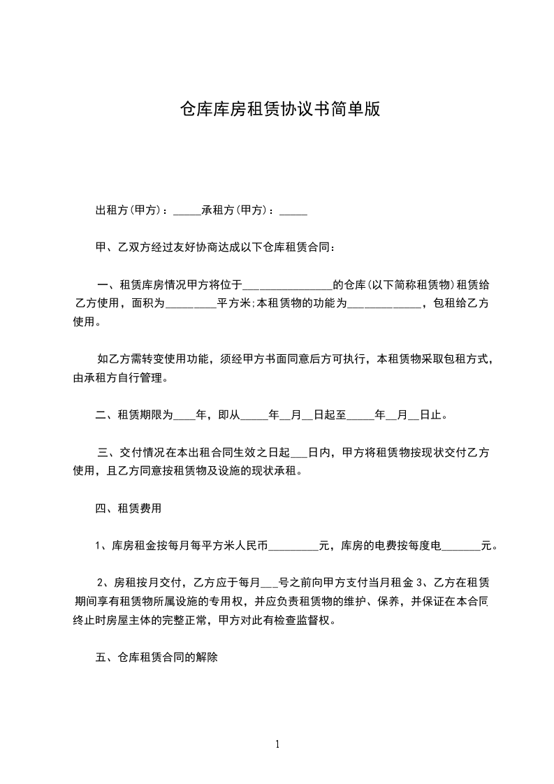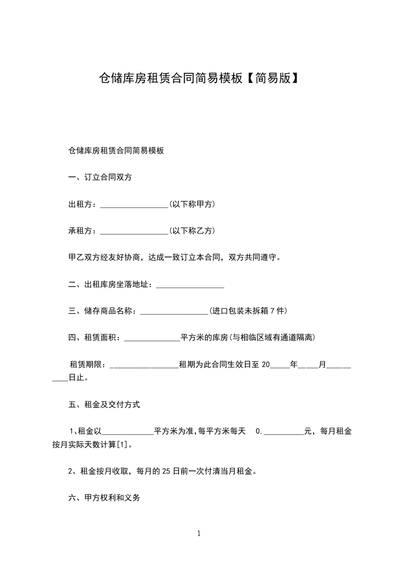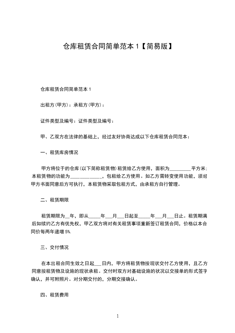 仓库租赁合同简单范本1