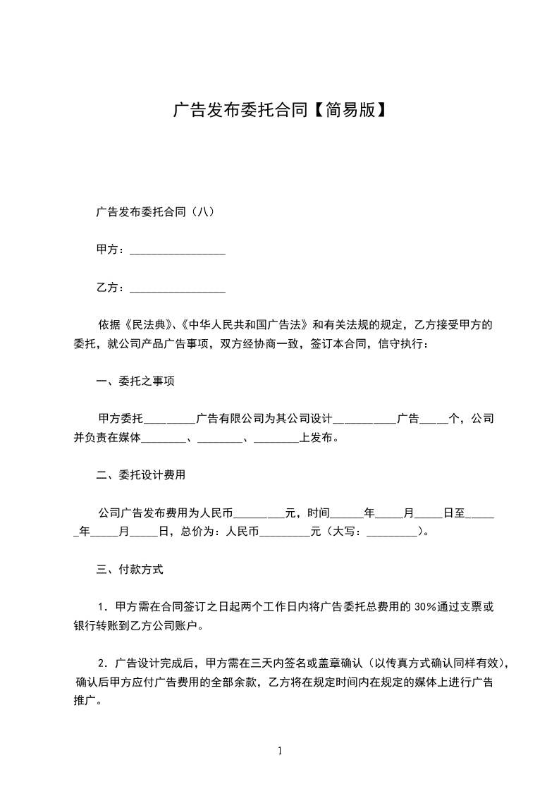 依据《民法典》、《中华人民共和国广告法》和有关法规的规定,乙方接受甲方的委托,就公司产品广告事项,双方经协商一致,签订本合同,信守执行: