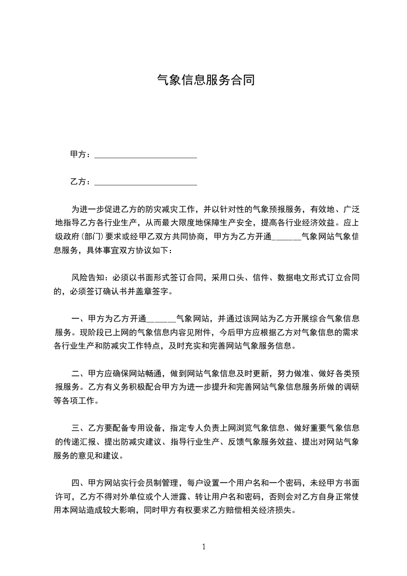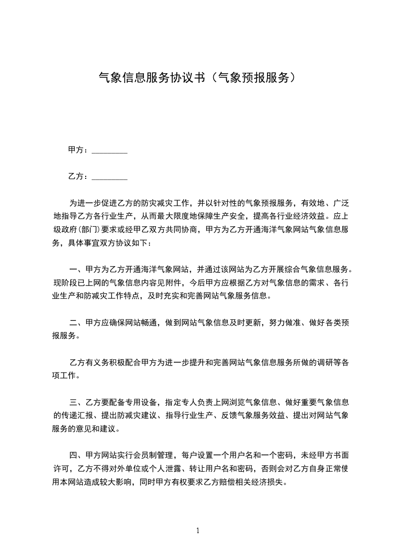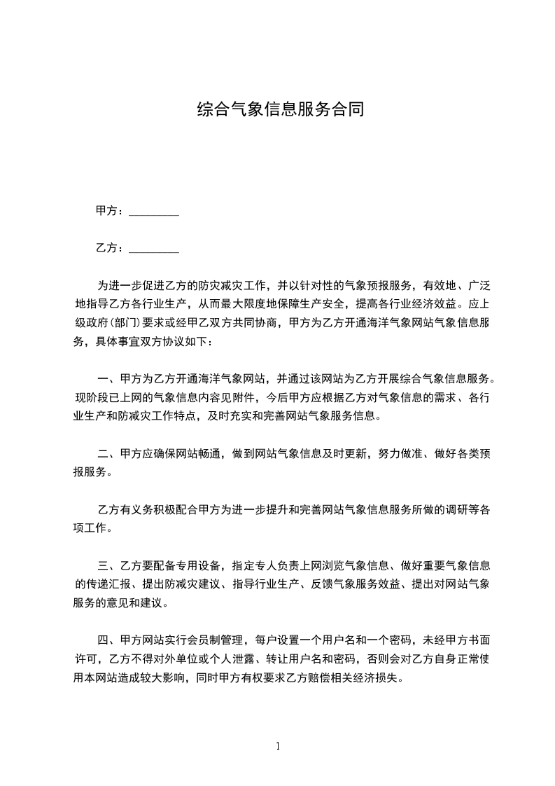 一、甲方为乙方开通_______气象网站,并通过该网站为乙方开展综合气象信息服务。现阶段已上网的气象信息内容见附件,今后甲方应根据乙方对气象信息的需求、各行业生产和防减灾工作特点,及时充实和完善网站气象服务信息。