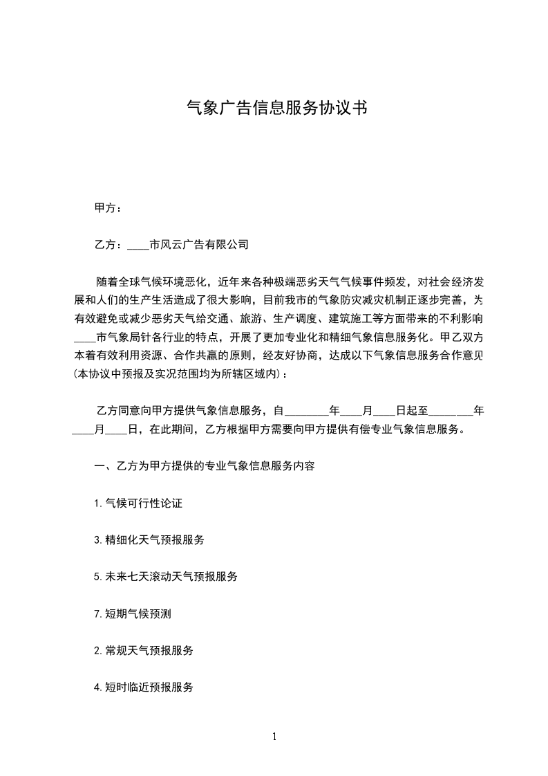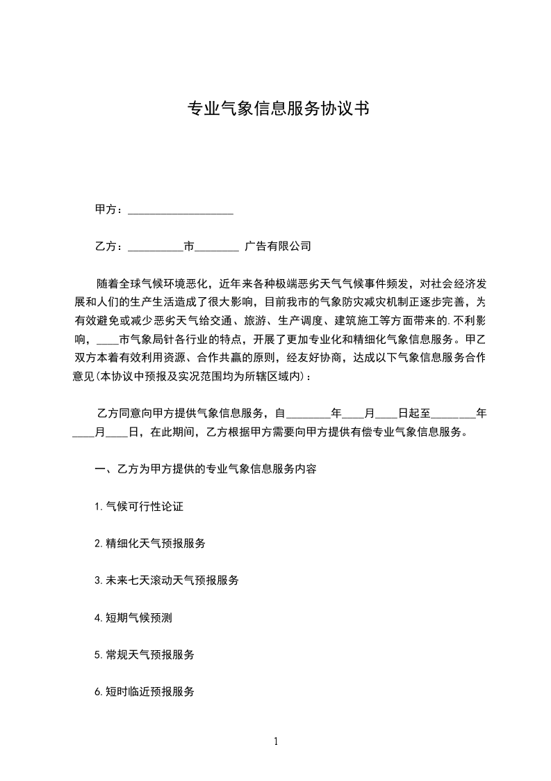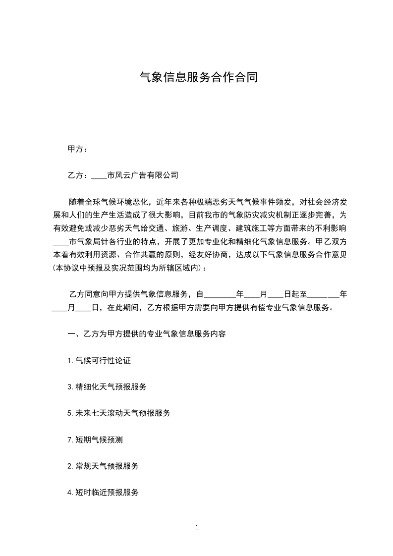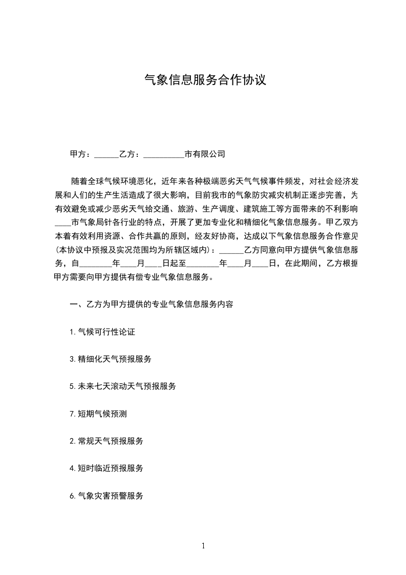 一、甲方为乙方开通_______气象网站,并通过该网站为乙方开展综合气象信息服务。现阶段已上网的气象信息内容见附件,今后甲方应根据乙方对气象信息的需求、各行业生产和防减灾工作特点,及时充实和完善网站气象服务信息。