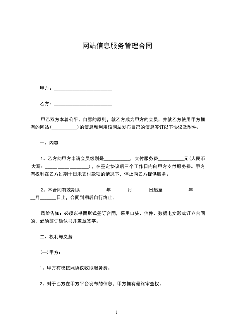 甲乙双方本着公平、自愿的原则,就乙方成为甲方的会员,并就乙方使用甲方拥有的网站(___________)的信息和利用该网站发布自己的信息签订以下协议及附件。