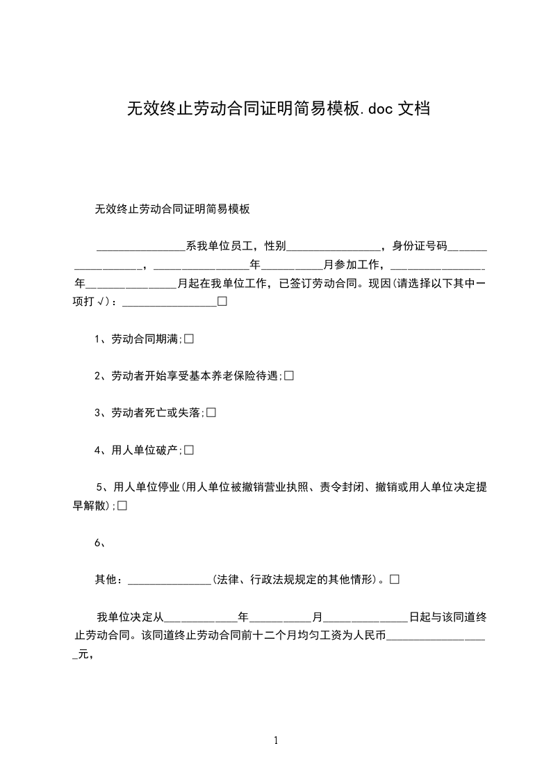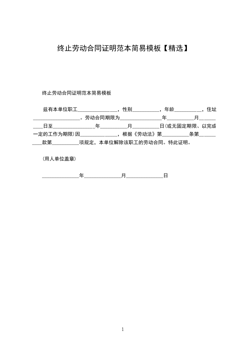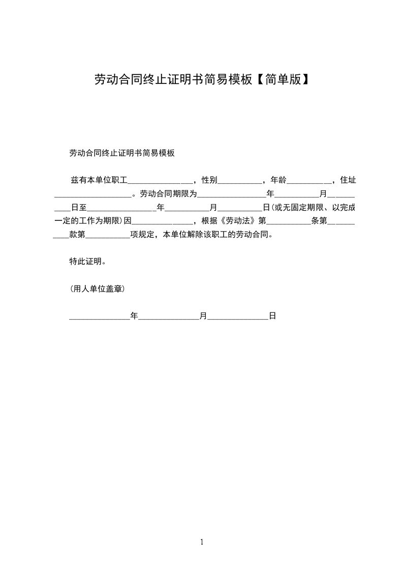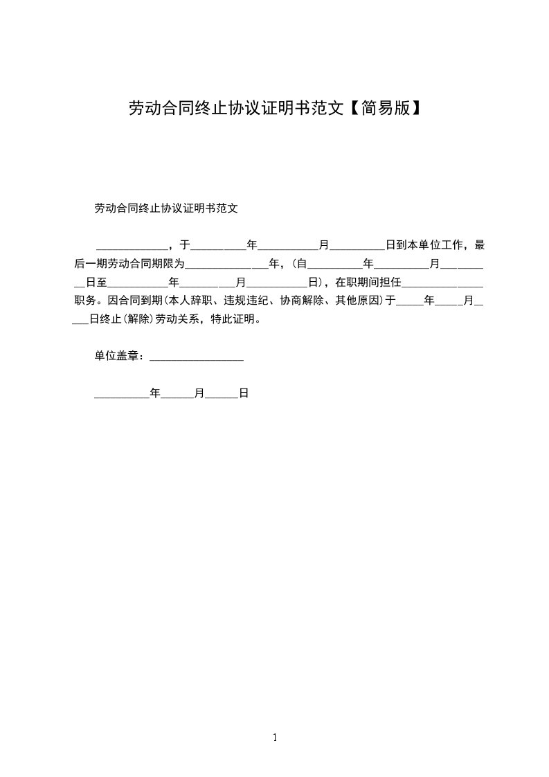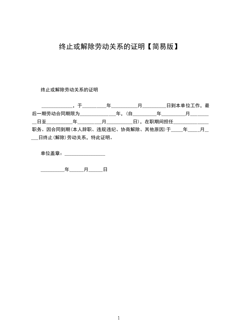 _____________,于__________年___________月__________日到本单位工作,最后一期劳动合同期限为_______________年,(自__________年__________月__________日至___________年__________月___________日),在职期间担任_______________职务。因合同到期(本人辞职、违规违纪、协商解除、其他原因)于_____年_____月_____日终止(解除)劳动关系,特此证明。