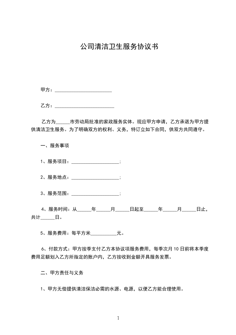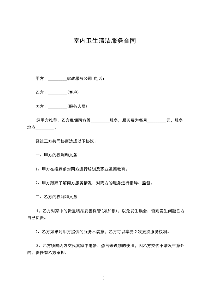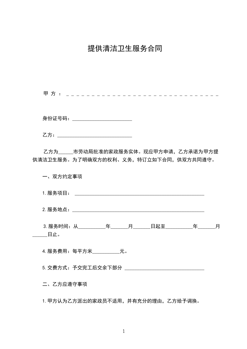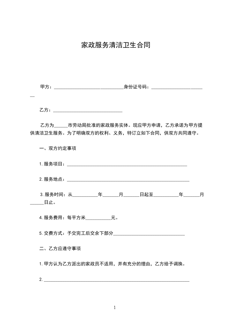 乙方为______市劳动局批准的家政服务实体。现应甲方申请,乙方承诺为甲方提供清洁卫生服务。为了明确双方的权利、义务,特订立如下合同,供双方共同遵守。