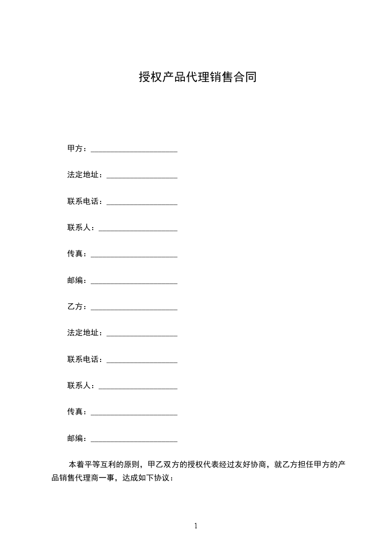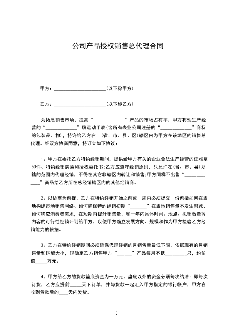 为拓展销售市场,提高“_____________”产品的市场占有率,甲方将现生产经营的“_____________”牌运动手表(含所有表业公司注册的“_____________”商标的包装品、物),特许给乙方在 (省、市、县、区)辖区内为甲方在该地区的销售总代理。经双方协商同意,特订立如下协议: