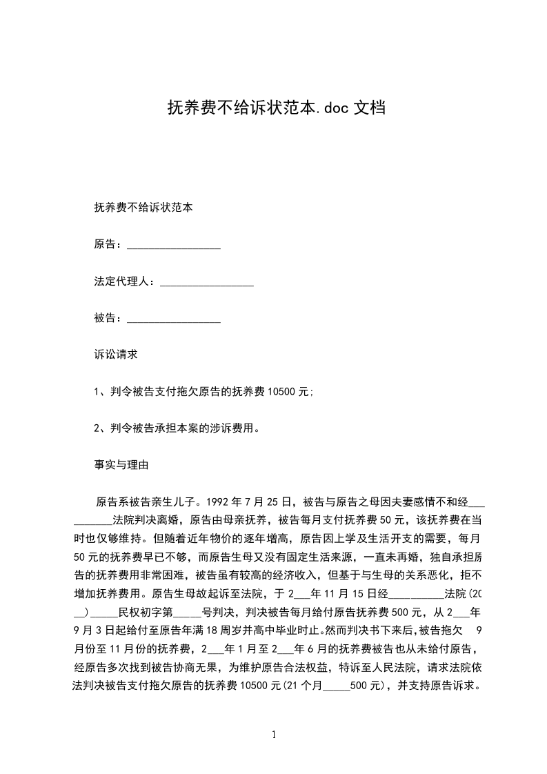 原告系被告亲生儿子。1992年7月25日,被告与原告之母因夫妻感情不和经__________法院判决离婚,原告由母亲抚养,被告每月支付抚养费50元,该抚养费在当时也仅够维持。但随着近年物价的逐年增高,原告因上学及生活开支的需要,每月50元的抚养费早已不够,而原告生母又没有固定生活来源,一直未再婚,独自承担原告的抚养费用非常困难,被告虽有较高的经济收入,但基于与生母的关系恶化,拒不增加抚养费用。原告生母故起诉至法院,于2___年11月15日经__________法院(20__)_____民权初字第_____号判决,判决被告每月给付原告抚养费500元,从2___年9月3日起给付至原告年满18周岁并高中毕业时止。然而判决书下来后,被告拖欠9月份至11月份的抚养费,2___年1月至2___年6月的抚养费被告也从未给付原告,经原告多次找到被告协商无果,为维护原告合法权益,特诉至人民法院,请求法院依法判决被告支付拖欠原告的抚养费10500元(21个月_____500元),并支持原告诉求。