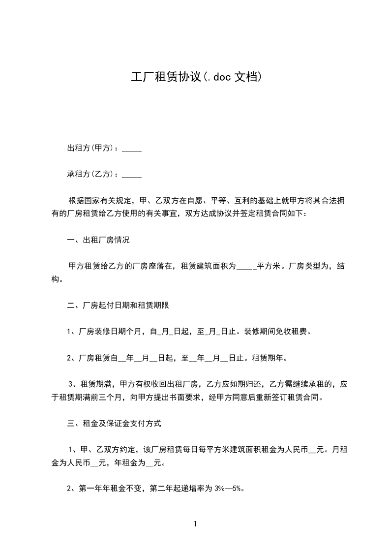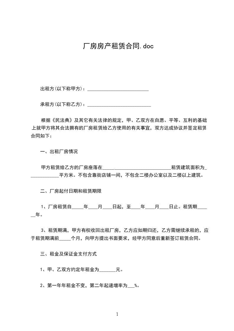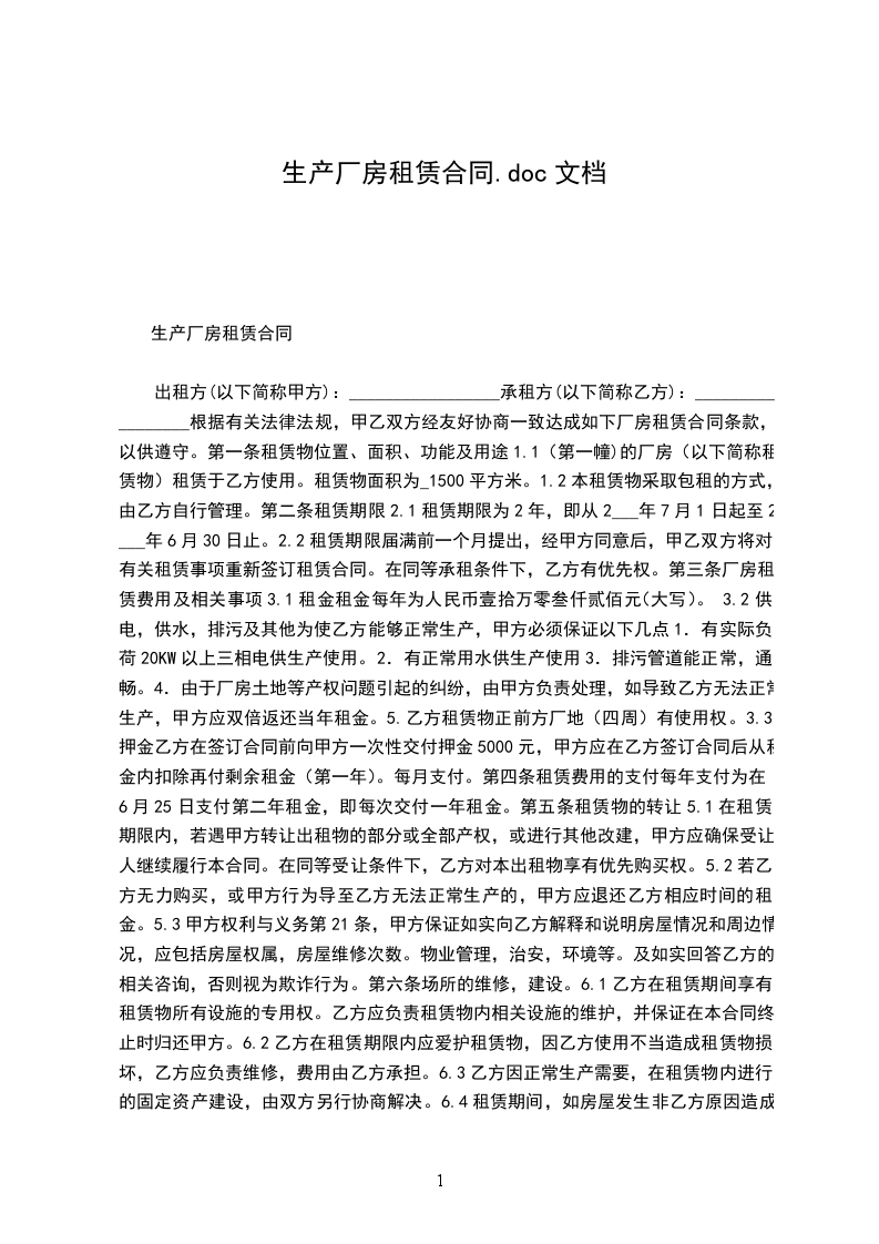 出租方(以下简称甲方):_________________承租方(以下简称乙方):_________________根据有关法律法规,甲乙双方经友好协商一致达成如下厂房租赁合同条款,以供遵守。第一条租赁物位置、面积、功能及用途1.1(第一幢)的厂房(以下简称租赁物)租赁于乙方使用。租赁物面积为_1500平方米。1.2本租赁物采取包租的方式,由乙方自行管理。第二条租赁期限2.1租赁期限为2年,即从2___年7月1日起至2___年6月30日止。2.2租赁期限届满前一个月提出,经甲方同意后,甲乙双方将对有关租赁事项重新签订租赁合同。在同等承租条件下,乙方有优先权。第三条厂房租赁费用及相关事项3.1租金租金每年为人民币壹拾万零叁仟贰佰元(大写)。3.2供电,供水,排污及其他为使乙方能够正常生产,甲方必须保证以下几点1.有实际负荷20KW以上三相电供生产使用。2.有正常用水供生产使用3.排污管道能正常,通畅。4.由于厂房土地等产权问题引起的纠纷,由甲方负责处理,如导致乙方无法正常生产,甲方应双倍返还当年租金。5.乙方租赁物正前方厂地(四周)有使用权。3.3押金乙方在签订合同前向甲方一次性交付押金5000元,甲方应在乙方签订合同后从租金内扣除再付剩余租金(第一年)。每月支付。第四条租赁费用的支付每年支付为在6月25日支付第二年租金,即每次交付一年租金。第五条租赁物的转让5.1在租赁期限内,若遇甲方转让出租物的部分或全部产权,或进行其他改建,甲方应确保受让人继续履行本合同。在同等受让条件下,乙方对本出租物享有优先购买权。5.2若乙方无力购买,或甲方行为导至乙方无法正常生产的,甲方应退还乙方相应时间的租金。5.3甲方权利与义务第21条,甲方保证如实向乙方解释和说明房屋情况和周边情况,应包括房屋权属,房屋维修次数。物业管理,治安,环境等。及如实回答乙方的相关咨询,否则视为欺诈行为。第六条场所的维修,建设。6.1乙方在租赁期间享有租赁物所有设施的专用权。乙方应负责租赁物内相关设施的维护,并保证在本合同终止时归还甲方。6.2乙方在租赁期限内应爱护租赁物,因乙方使用不当造成租赁物损坏,乙方应负责维修,费用由乙方承担。6.3乙方因正常生产需要,在租赁物内进行的固定资产建设,由双方另行协商解决。6.4租赁期间,如房屋发生非乙方原因造成的自然损坏,或人为损坏,或屋面漏水等,维修费用由甲方承担,甲方应在接到乙方通知之日起三天内予以修缮,超过三天,乙方有权自行修缮,但费用由甲方承担。第七条租赁物的转租租任期限内,乙方可将租赁物转租,但转租的管理工作由乙方负责,包括向转租户收取租金等。本合同规定的甲乙双方的责任和权利不因乙方转租而改变。如发生转租行为,乙方还必须遵守下列条款:_________________1、乙方应在转租租约中列明,倘乙方提前终止本合同,乙方与转租户的转租租约应同时终止。2、无论乙方是否提前终止本合同,乙方因转租行为产生的一切纠纷概由乙方负责处理。第八条合同的终止本合同提前终止或有效期届满,甲、乙双方未达成续租协议的,乙方应于终止之日或租赁期限届满之日迁离租赁物,并将其返还甲方。第九条适用法律本合同受中华人民共和国法律的管辖,本合同在履行中发生争议,应由双方协商解决,若协商不成,则通过仲裁程序解决.第十一条其它条款11.1本合同未尽事宜,经双方协商一致后,可另行签订补充协议。11.2本合同一式两份,甲、乙双方各执一份。第十二条1.合同效力本合同经双方签字盖章,并收到乙方支付的首期租赁款项和押金后生效。2.甲方:________________身份证:_________________地址:________________电话:_____________签订时间:_____________年_____月_____日3.乙方:________________身份证:_________________地址:________________电话:______________签订时间:_____________年_____月_____日