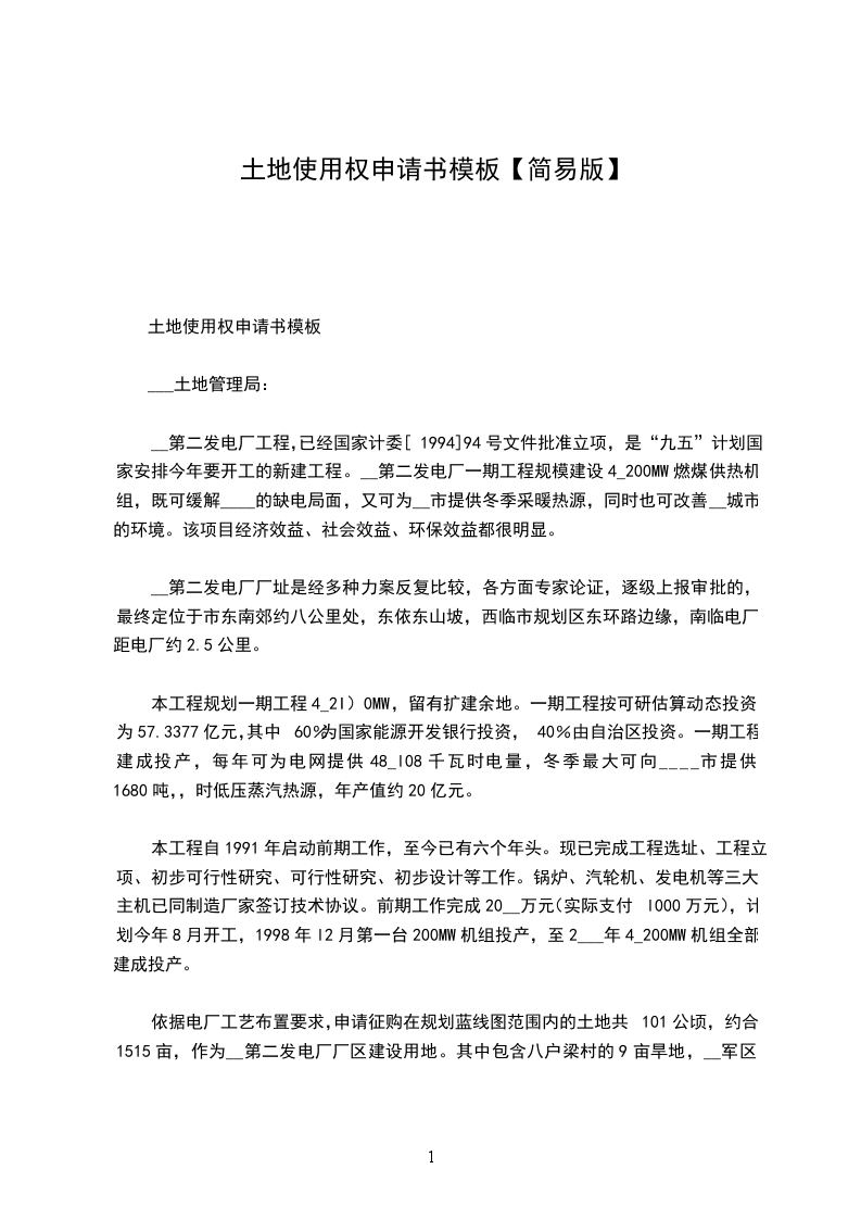 依据电厂工艺布置要求,申请征购在规划蓝线图范围内的土地共101公顷,约合1515亩,作为__第二发电厂厂区建设用地。其中包含八户梁村的9亩旱地,__军区36007部队7.32亩林带,其余均为天然草场,特请贵局办理有关__电厂用地报批和征地取证手续。望划定红线,以便早日开工。