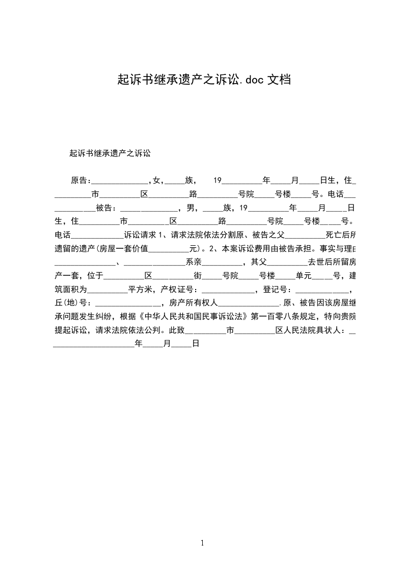 原告:______________,女,_____族,19__________年_____月_____日生,住__________市__________区__________路__________号院_____号楼_____号。电话_____________被告:______________,男,_____族,19__________年_____月_____日生,住__________市__________区__________路__________号院_____号楼_____号。电话_____________诉讼请求1、请求法院依法分割原、被告之父__________死亡后所遗留的遗产(房屋一套价值__________元)。2、本案诉讼费用由被告承担。事实与理由_______________、_______________系亲__________,其父__________去世后所留房产一套,位于__________区__________街_____号院_____号楼_____单元_____号,建筑面积为__________平方米,产权证号:_____________,登记号:_____________,丘(地)号:________________,房产所有权人_______________.原、被告因该房屋继承问题发生纠纷,根据《中华人民共和国民事诉讼法》第一百零八条规定,特向贵院提起诉讼,请求法院依法公判。此致__________市__________区人民法院具状人:______________________年_____月_____日