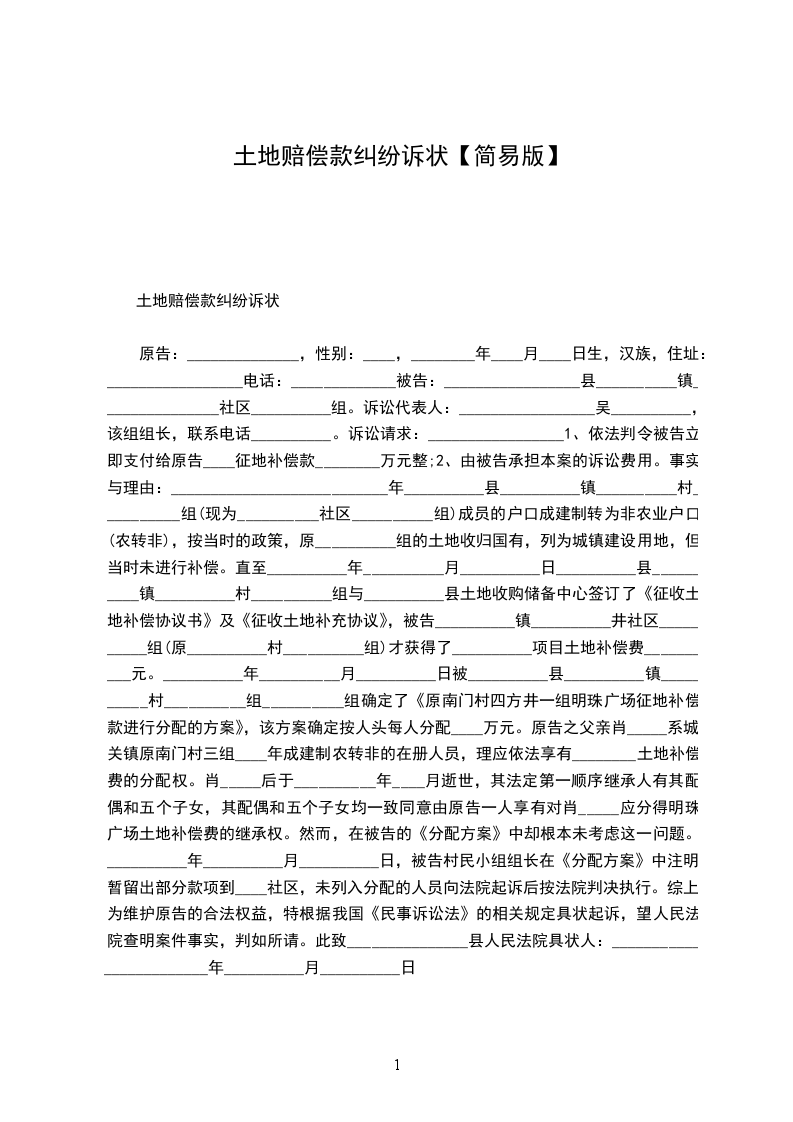 土地赔偿款纠纷诉状