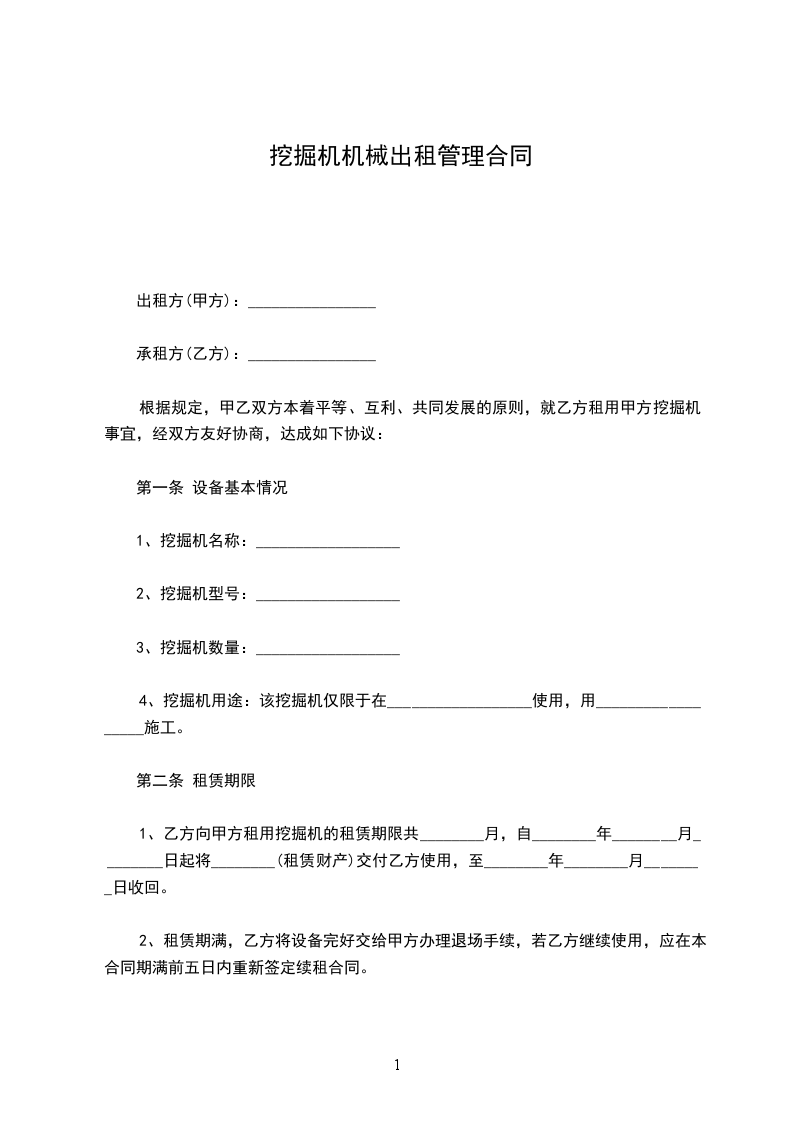 1、乙方向甲方租用挖掘机的租赁期限共________月,自________年________月________日起将________(租赁财产)交付乙方使用,至________年________月________日收回。