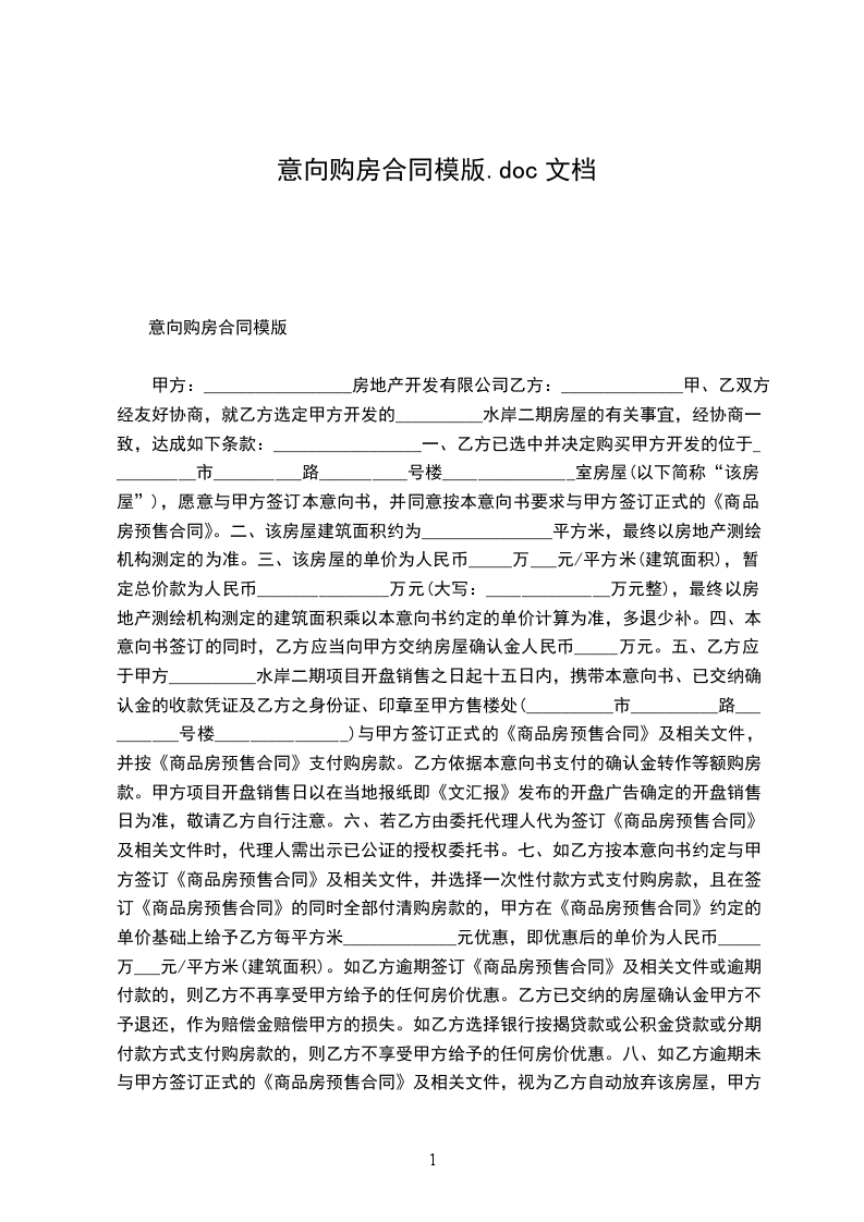 甲方:_________________房地产开发有限公司乙方:______________甲、乙双方经友好协商,就乙方选定甲方开发的__________水岸二期房屋的有关事宜,经协商一致,达成如下条款:_________________一、乙方已选中并决定购买甲方开发的位于__________市__________路__________号楼_______________室房屋(以下简称“该房屋”),愿意与甲方签订本意向书,并同意按本意向书要求与甲方签订正式的《商品房预售合同》。二、该房屋建筑面积约为_______________平方米,最终以房地产测绘机构测定的为准。三、该房屋的单价为人民币_____万___元/平方米(建筑面积),暂定总价款为人民币_______________万元(大写:______________万元整),最终以房地产测绘机构测定的建筑面积乘以本意向书约定的单价计算为准,多退少补。四、本意向书签订的同时,乙方应当向甲方交纳房屋确认金人民币_____万元。五、乙方应于甲方__________水岸二期项目开盘销售之日起十五日内,携带本意向书、已交纳确认金的收款凭证及乙方之身份证、印章至甲方售楼处(__________市__________路__________号楼_______________)与甲方签订正式的《商品房预售合同》及相关文件,并按《商品房预售合同》支付购房款。乙方依据本意向书支付的确认金转作等额购房款。甲方项目开盘销售日以在当地报纸即《文汇报》发布的开盘广告确定的开盘销售日为准,敬请乙方自行注意。六、若乙方由委托代理人代为签订《商品房预售合同》及相关文件时,代理人需出示已公证的授权委托书。七、如乙方按本意向书约定与甲方签订《商品房预售合同》及相关文件,并选择一次性付款方式支付购房款,且在签订《商品房预售合同》的同时全部付清购房款的,甲方在《商品房预售合同》约定的单价基础上给予乙方每平方米_____________元优惠,即优惠后的单价为人民币_____万___元/平方米(建筑面积)。如乙方逾期签订《商品房预售合同》及相关文件或逾期付款的,则乙方不再享受甲方给予的任何房价优惠。乙方已交纳的房屋确认金甲方不予退还,作为赔偿金赔偿甲方的损失。如乙方选择银行按揭贷款或公积金贷款或分期付款方式支付购房款的,则乙方不享受甲方给予的任何房价优惠。八、如乙方逾期未与甲方签订正式的《商品房预售合同》及相关文件,视为乙方自动放弃该房屋,甲方有权无需通知乙方而将该房屋另行出售,乙方依据本意向书已交纳的确认金不予退还。九、本意向书签订后,如乙方提出不购买该房屋,乙方已交纳的确认金不予退还。十、乙方已知__________水岸二期的相关开发建设手续,包括《商品房预售许可证》等正在办理之中。如因该项目规划、设计变更,致使该房屋不再建设,本意向书失效;或因规划、设计变更致使该房屋户型、朝向变化而乙方提出不再购买该房屋的,本意向书失效。以上情况甲方应当无息退还乙方已交纳的确认金,不再承担其他责任。十一、本意向书签订后甲方不得另行出售该房屋,除非本意向书约定的另行出售条件具备或本意向书失效。十二、本意向书仅限于乙方本人享有,不得转让,《商品房预售合同》中的买受人应当与本意向书中的乙方一致,否则,视为乙方放弃购买该房屋,甲方有权拒绝与其签订《商品房预售合同》及相关文件,并有权将该房屋另行出售。乙方承诺甲方已告知乙方所选定的房屋为商品房,所缴纳契税按办理该房屋产权时政府规定的契税标准执行。十三、乙方的通讯地址及联系方式以本意向书记载为准,为甲方向乙方发出任何书面通知的唯一地址,乙方保证通讯地址、联系电话准确无误且长期有效,如有变更乙方应当以书面形式自变更之时起24小时内通知甲方。否则,由此引发的一切责任由乙方承担,与甲方无关。十四、本意向书经甲、乙双方签字、盖章且乙方全额交纳确认金之日起生效,在正式的《商品房预售合同》生效同时失效,乙方同意届时将本意向书原件交还甲方。十五、本意向书一式叁份,甲方执贰份、乙方执一份,具有同等法律效力。甲方:_________________房地产开发有限公司乙方:______________身份证号:______________电话:______________通讯地址:______________邮编:______________签署日期:______________年_____月_____日