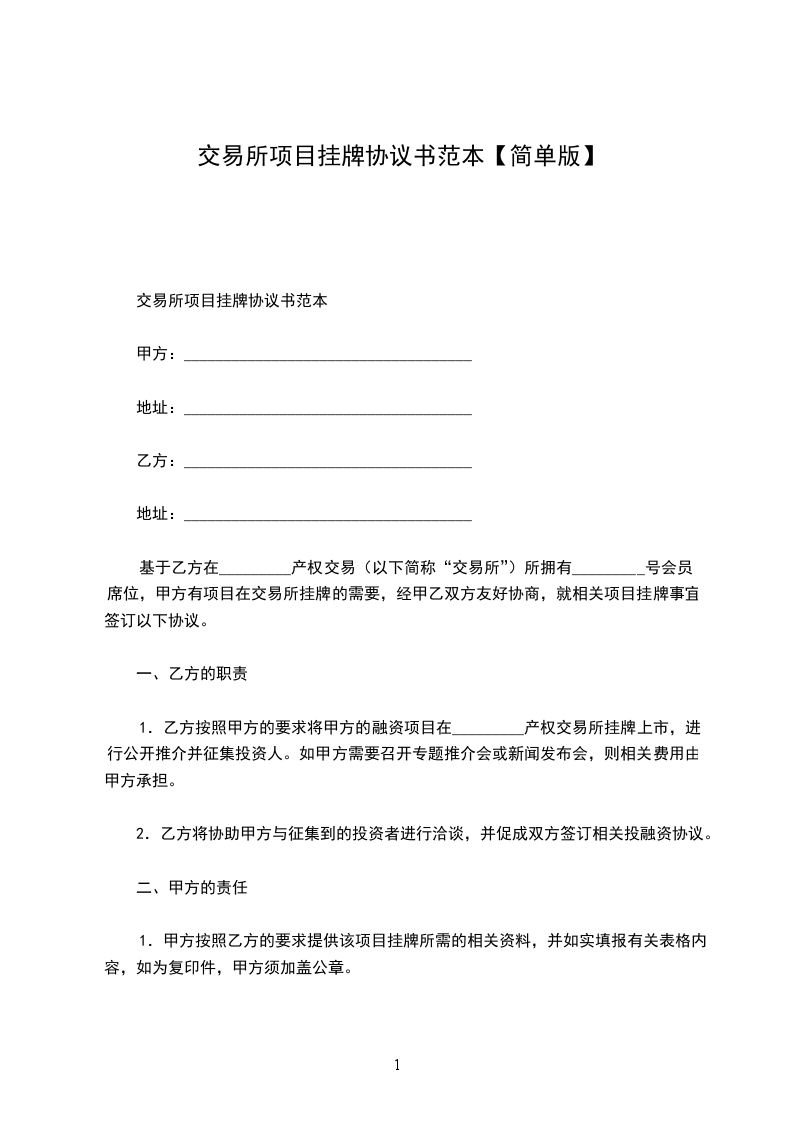 基于乙方在_________产权交易(以下简称“交易所”)所拥有_________号会员席位,甲方有项目在交易所挂牌的需要,经甲乙双方友好协商,就相关项目挂牌事宜签订以下协议。
