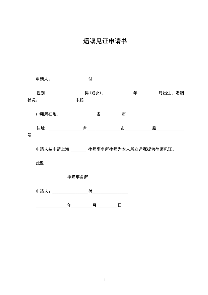 遗嘱立遗嘱人:_________________王__________,男,__________年_____月_____日出生,汉族,现住______市__________路_____号_____室,身份证号:______________。我今年_______岁,在立遗嘱时精神清醒,由于__年事已高,并患有高血压等疾病,可能发生意外,故立遗嘱,由于我握笔困难,由___________律师代我起草本遗嘱,由上__________律师事务所__________律师、__________律师进行见证。遗嘱内容如下:_________________1、将我位于_______市__________路_____号_____室的房产一栋(房产证号:______________)由儿子__________继承。2、除上述房产外,我其余的财产按照国家有关法律进行处理。3、我指定唐建东律师作为我的遗嘱执行人。5、本遗嘱一式三份,我本人、遗嘱执行人、____________律师事务所各保管一份,继承开始时由执行人负责实施。立遗嘱人:__________________________代书人:_____________律师证明人:___________________________时间:_________________