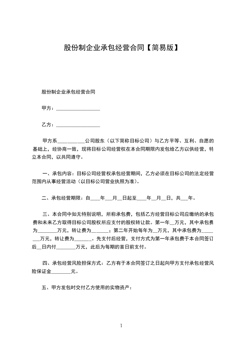 甲方系___________公司股东(以下简称目标公司)与乙方平等、互利、自愿的基础上,经协商一致,现将目标公司经营权在本合同期限内发包给乙方以供经营,特立本合同,以共同遵守。