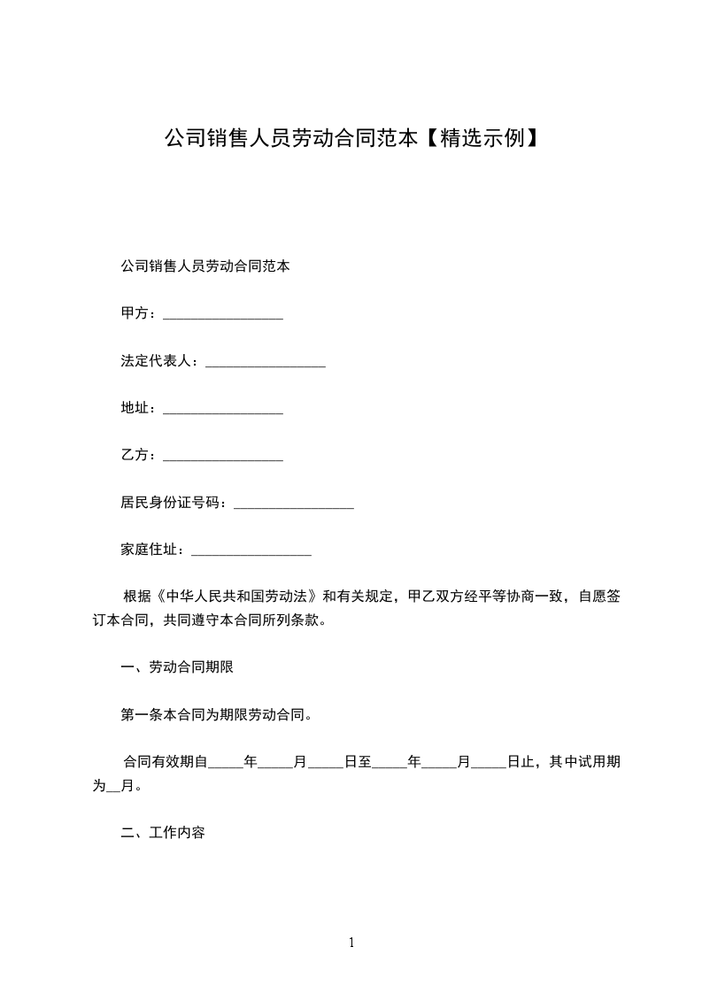 公司销售人员劳动合同范本
