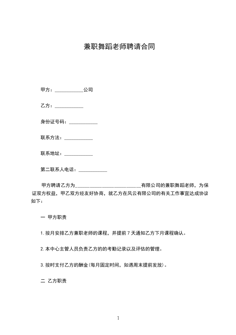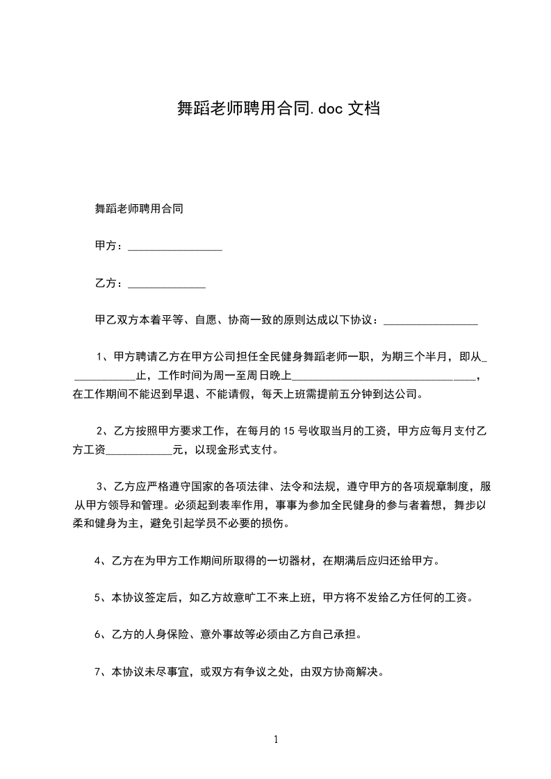 1、甲方聘请乙方在甲方公司担任全民健身舞蹈老师一职,为期三个半月,即从____________止,工作时间为周一至周日晚上_________________________________,在工作期间不能迟到早退、不能请假,每天上班需提前五分钟到达公司。