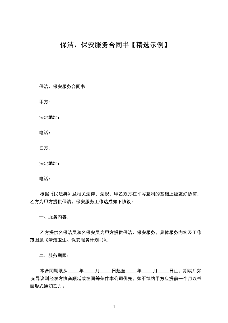 根据《民法典》及相关法律、法规,甲乙双方在平等互利的基础上经友好协商,乙方为甲方提供保洁、保安服务工作达成如下协议:
