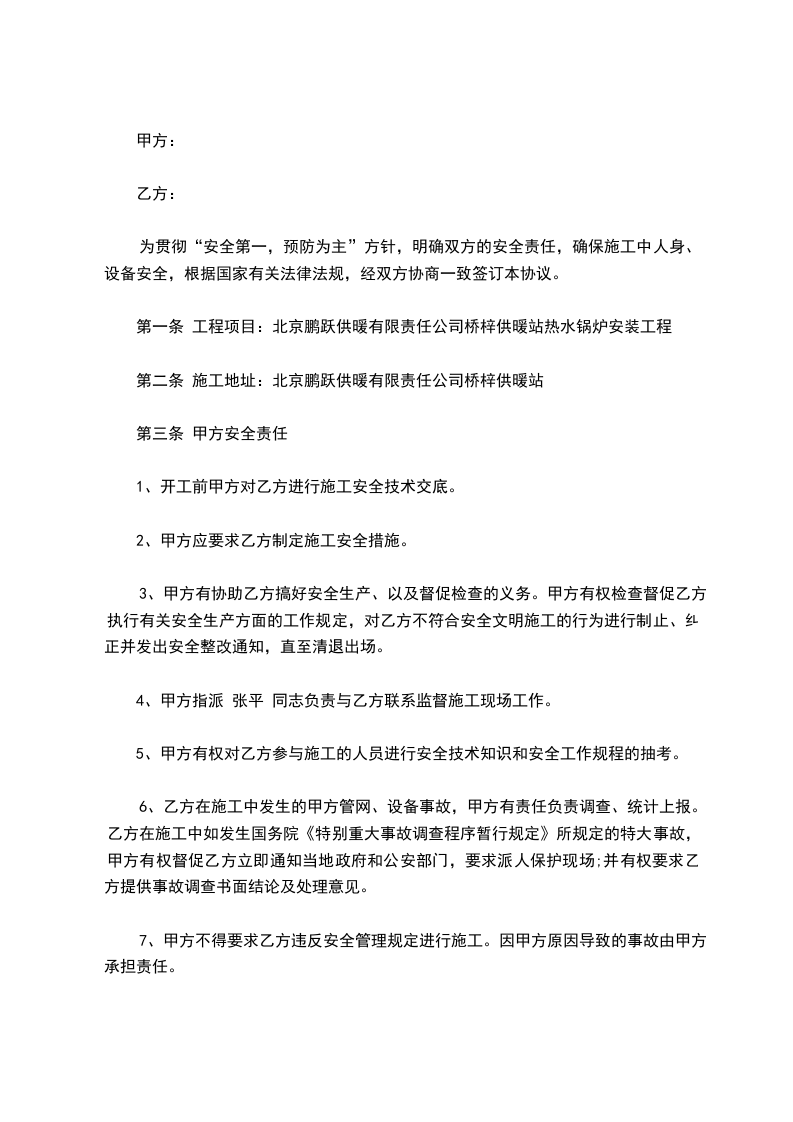 为贯彻“安全第一,预防为主”方针,明确双方的安全责任,确保施工中人身、设备安全,根据国家有关法律法规,经双方协商一致签订本协议。