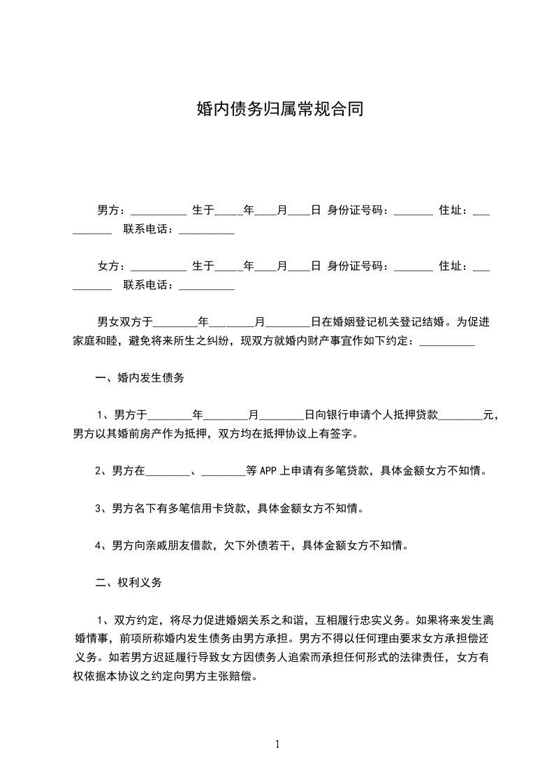 1、双方约定,将尽力促进婚姻关系之和谐,互相履行忠实义务。如果将来发生离婚情事,前项所称婚内发生债务由男方承担。男方不得以任何理由要求女方承担偿还义务。如若男方迟延履行导致女方因债务人追索而承担任何形式的法律责任,女方有权依据本协议之约定向男方主张赔偿。