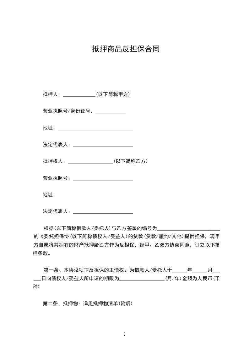 第一条、本协议项下反担保的主债权:为借款人/受托人于______年______月______日向债权人/受益人所申请的期限为__________________(月/年)金额为人民币(币种)