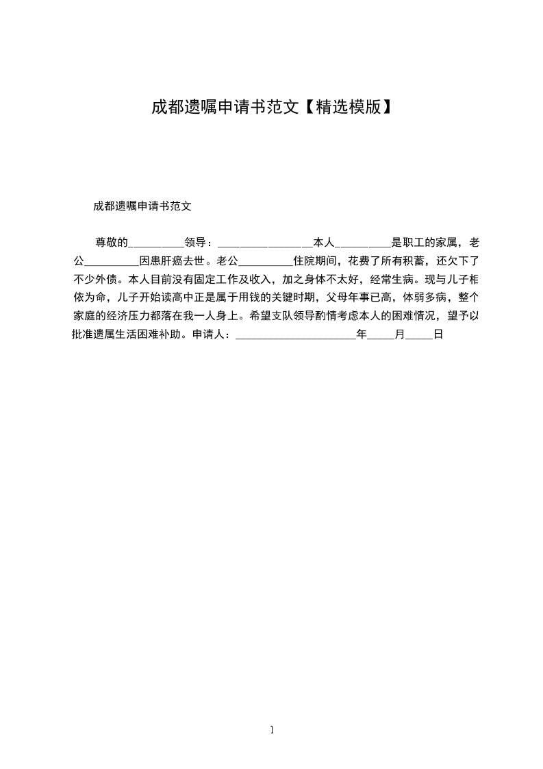 尊敬的__________领导:_________________本人__________是职工的家属,老公__________因患肝癌去世。老公__________住院期间,花费了所有积蓄,还欠下了不少外债。本人目前没有固定工作及收入,加之身体不太好,经常生病。现与儿子相依为命,儿子开始读高中正是属于用钱的关键时期,父母年事已高,体弱多病,整个家庭的经济压力都落在我一人身上。希望支队领导酌情考虑本人的困难情况,望予以批准遗属生活困难补助。申请人:______________________年_____月_____日