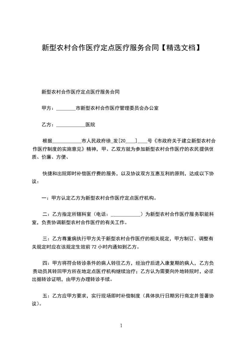根据____________市人民政府徐_发[20____]____号《市政府关于建立新型农村合作医疗制度的实施意见》精神,甲、乙双方就为参加新型农村合作医疗的农民提供优质、价廉、方便、