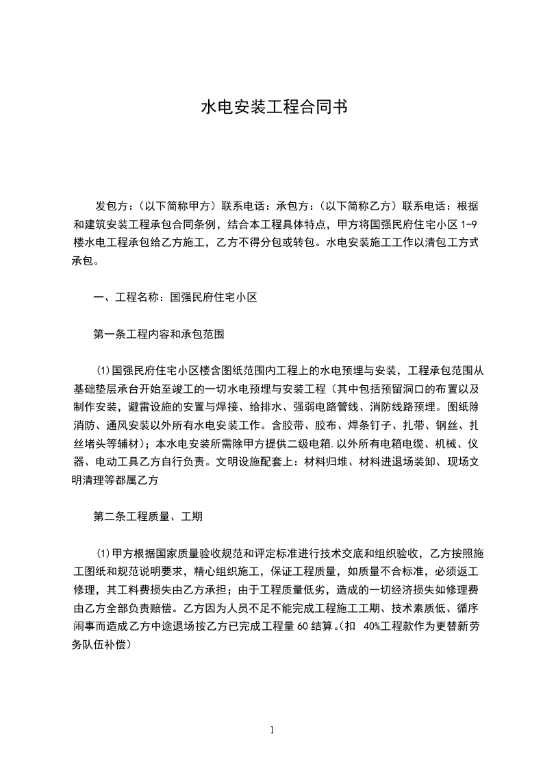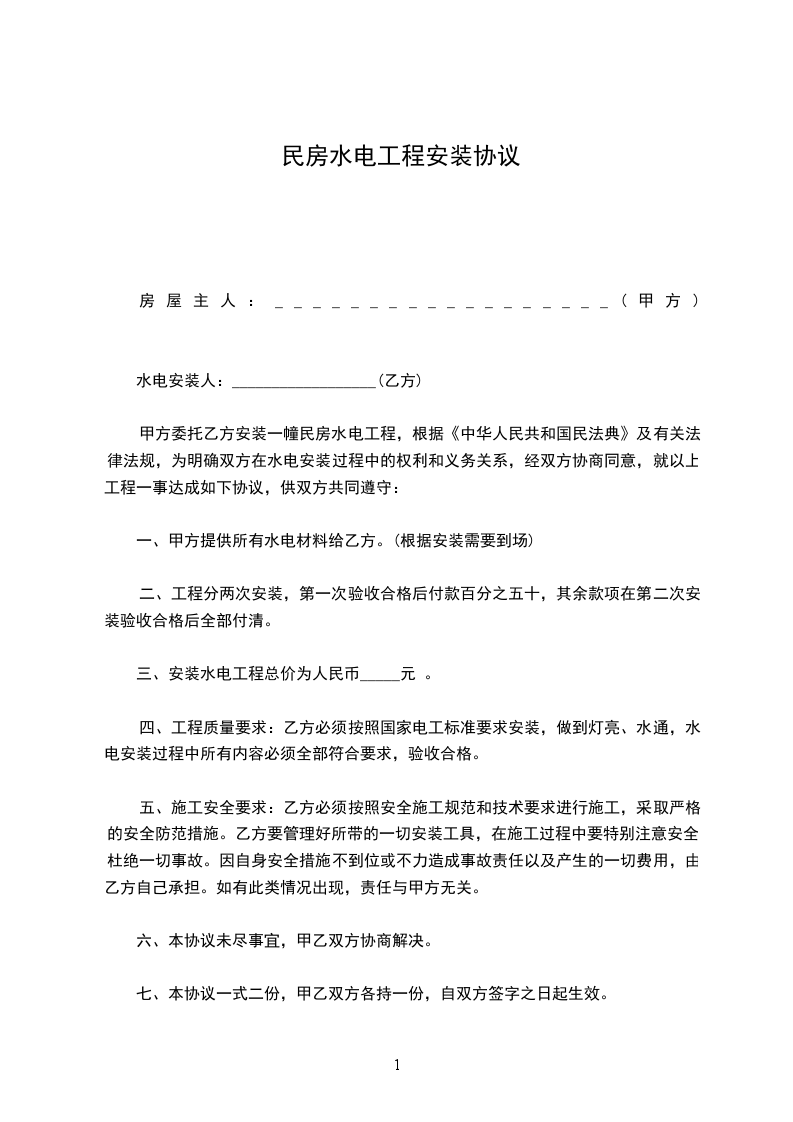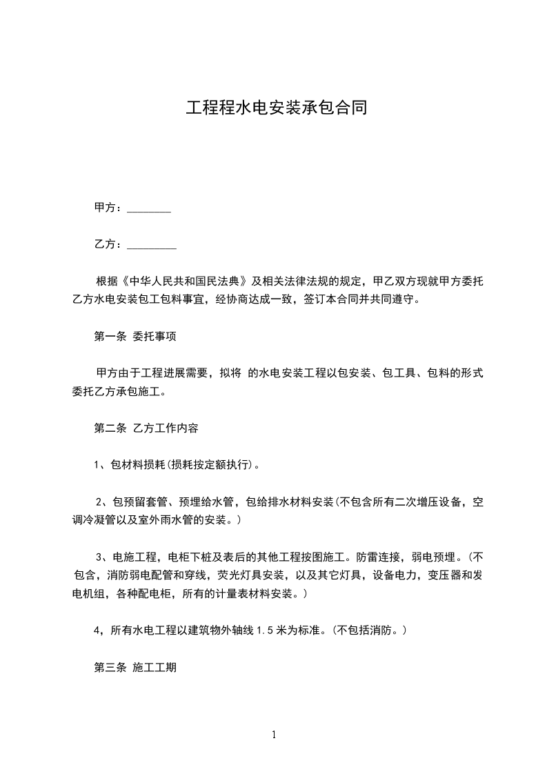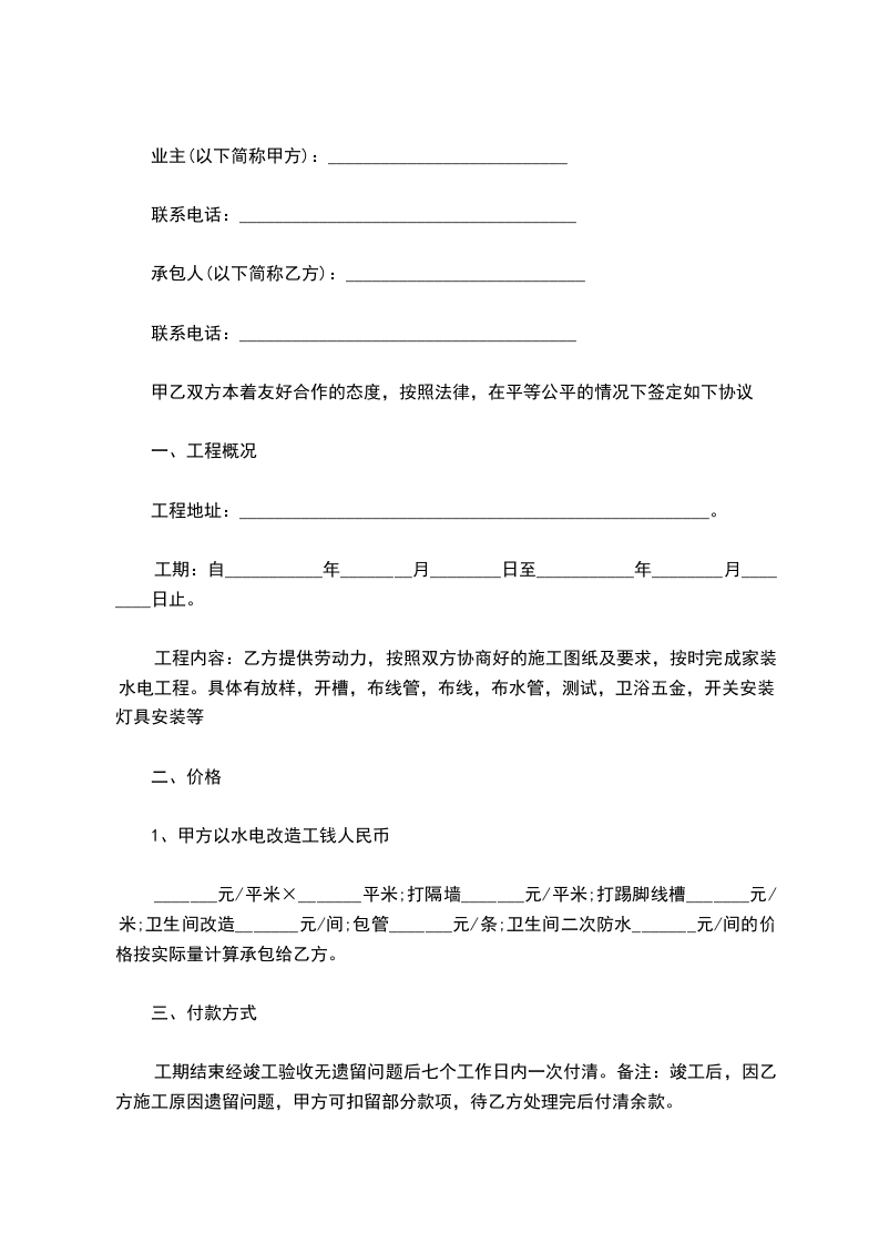 甲、乙双方在平等、自愿、协商一致的基础上,本着相互信任的原则,就甲方的水电工程达成以下协议。
