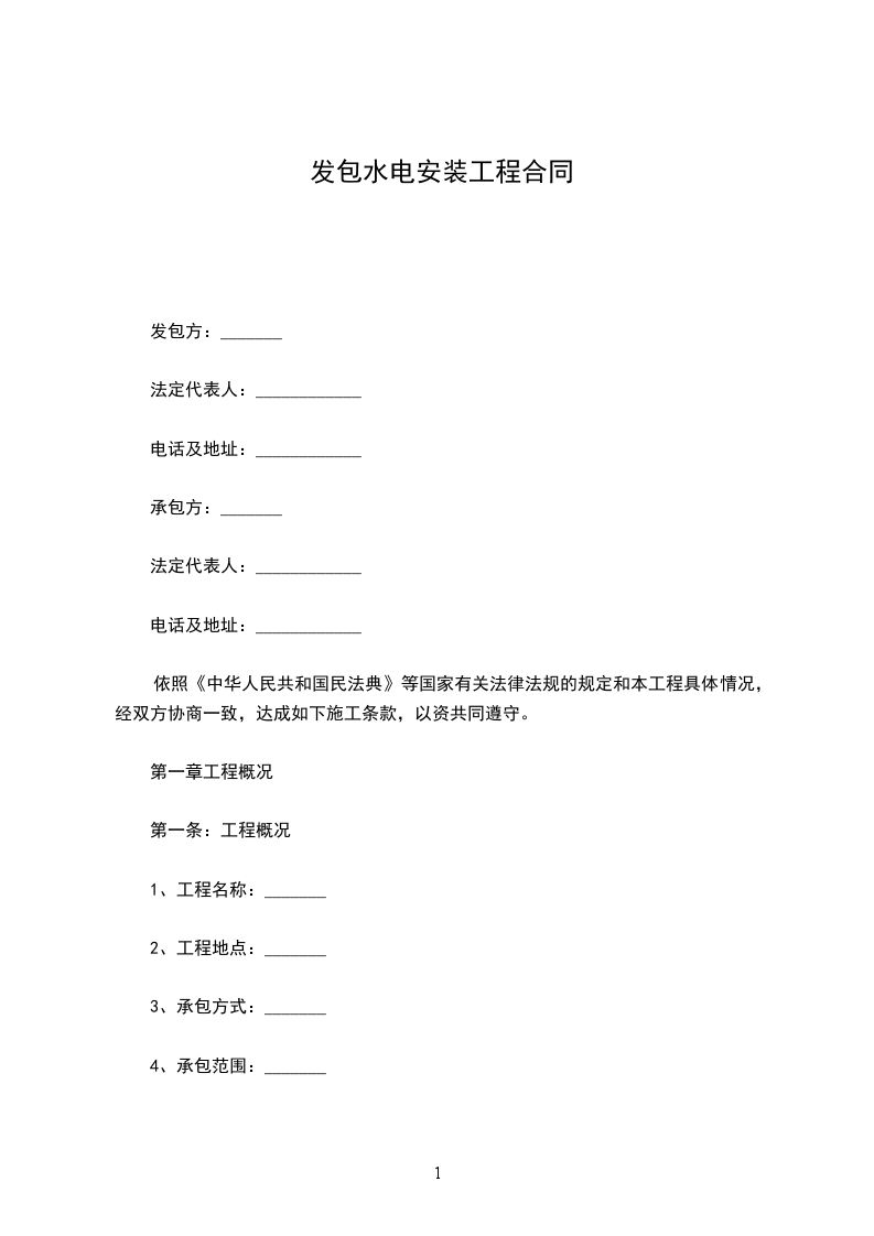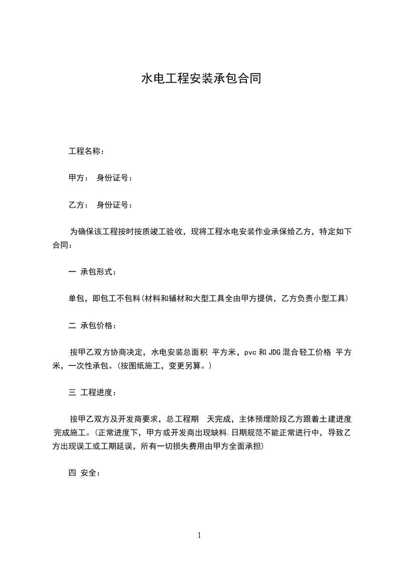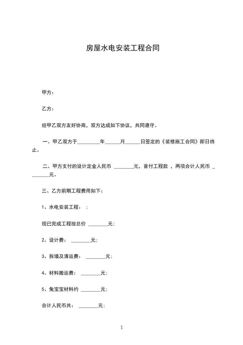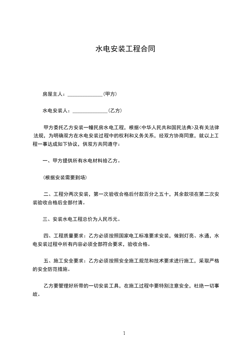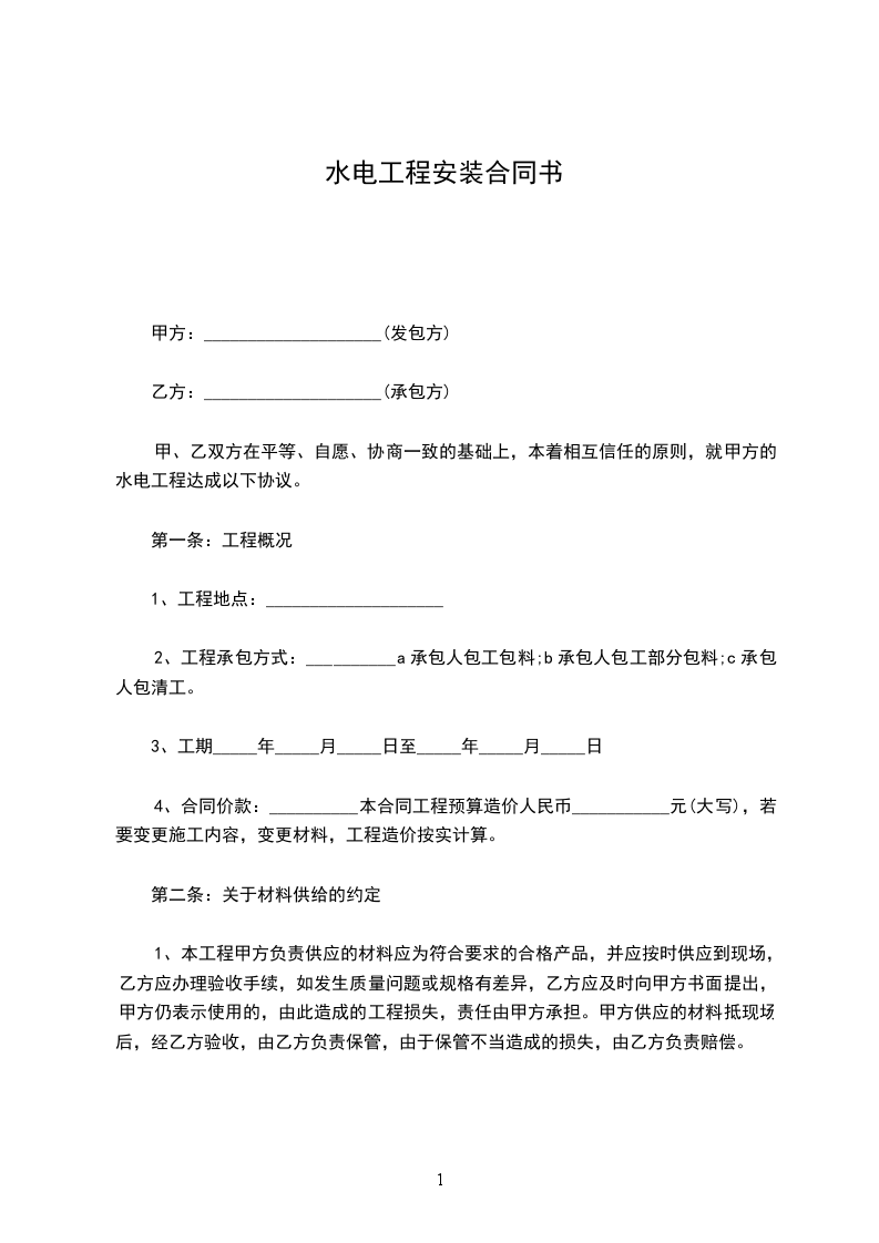 甲、乙双方在平等、自愿、协商一致的基础上,本着相互信任的原则,就甲方的水电工程达成以下协议。