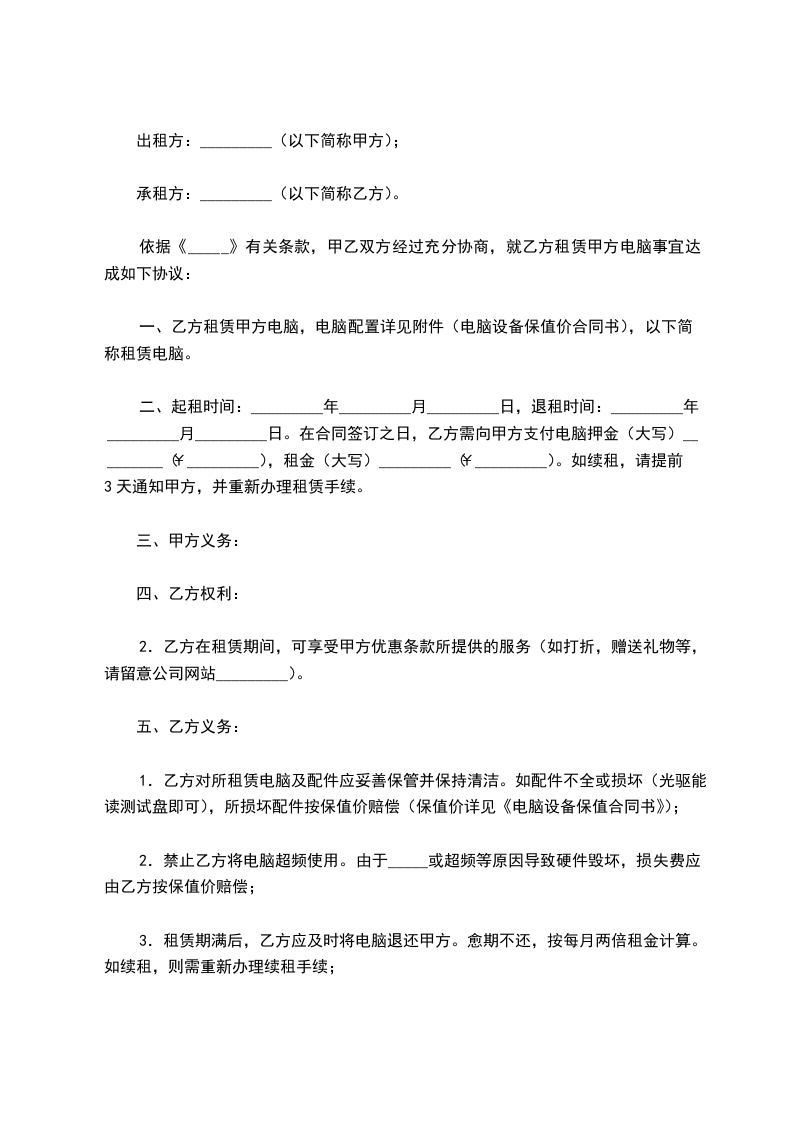 3.租赁期满后,乙方应及时将电脑退还甲方。愈期不还,按每月两倍租金计算。如续租,则需重新办理续租手续;