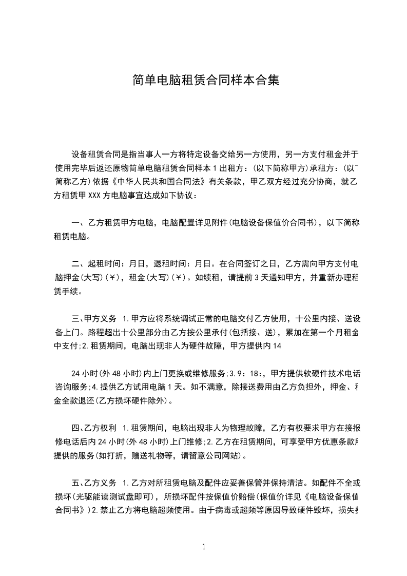 1.乙方对所租赁电脑及配件应妥善保管并保持清洁。如配件不全或损坏(光驱能读测试盘即可),所损坏配件按保值价赔偿(保值价详见《电脑设备保值合同书》);