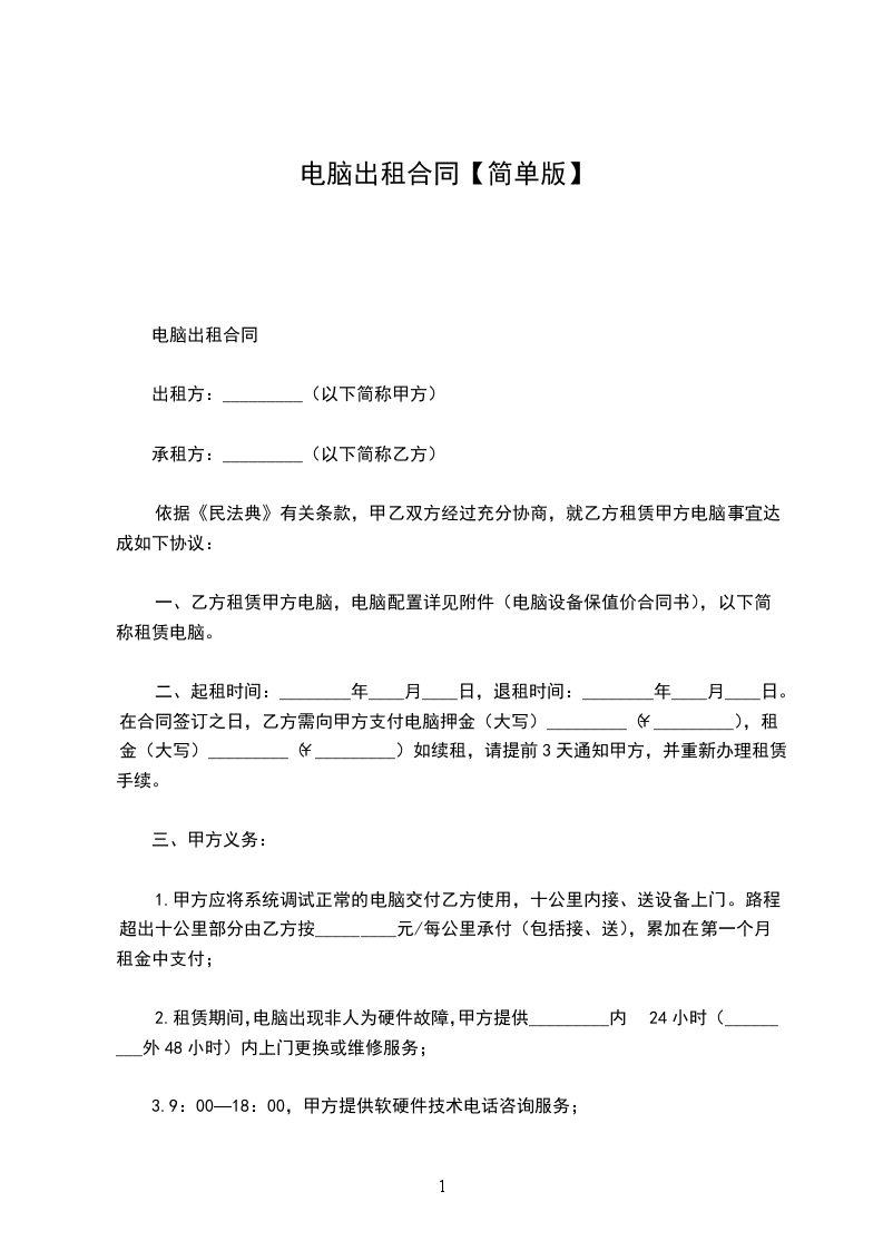 依据《民法典》有关条款,甲乙双方经过充分协商,就乙方租赁甲方电脑事宜达成如下协议: