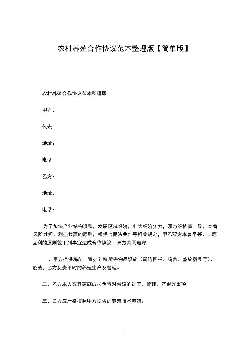 农村养殖合作协议范本整理版