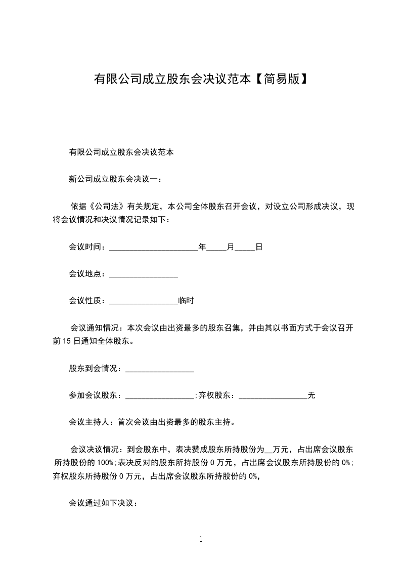 有限公司成立股东会决议范本