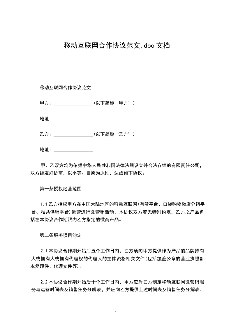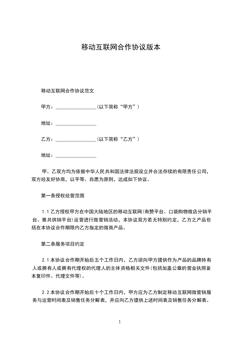 1.1乙方授权甲方在中国大陆地区的移动互联网(有赞平台、口袋购物微店分销平台、雅共供销平台)运营进行微营销活动,本协议双方若无特别约定,乙方之产品包括在本协议合作期限内乙方指定的微商产品。