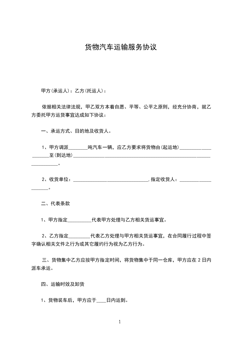 1、甲方调派________吨汽车一辆,应乙方要求将货物由(起运地)____________________至(到达地)____________________________________________________________________。