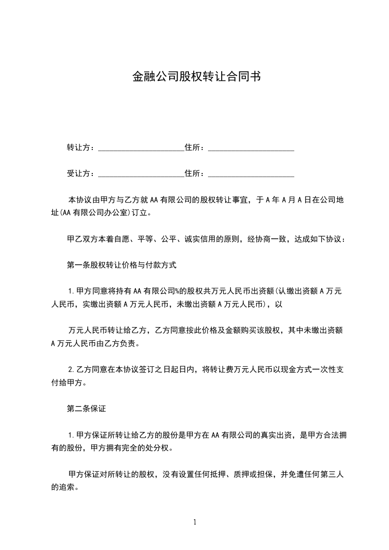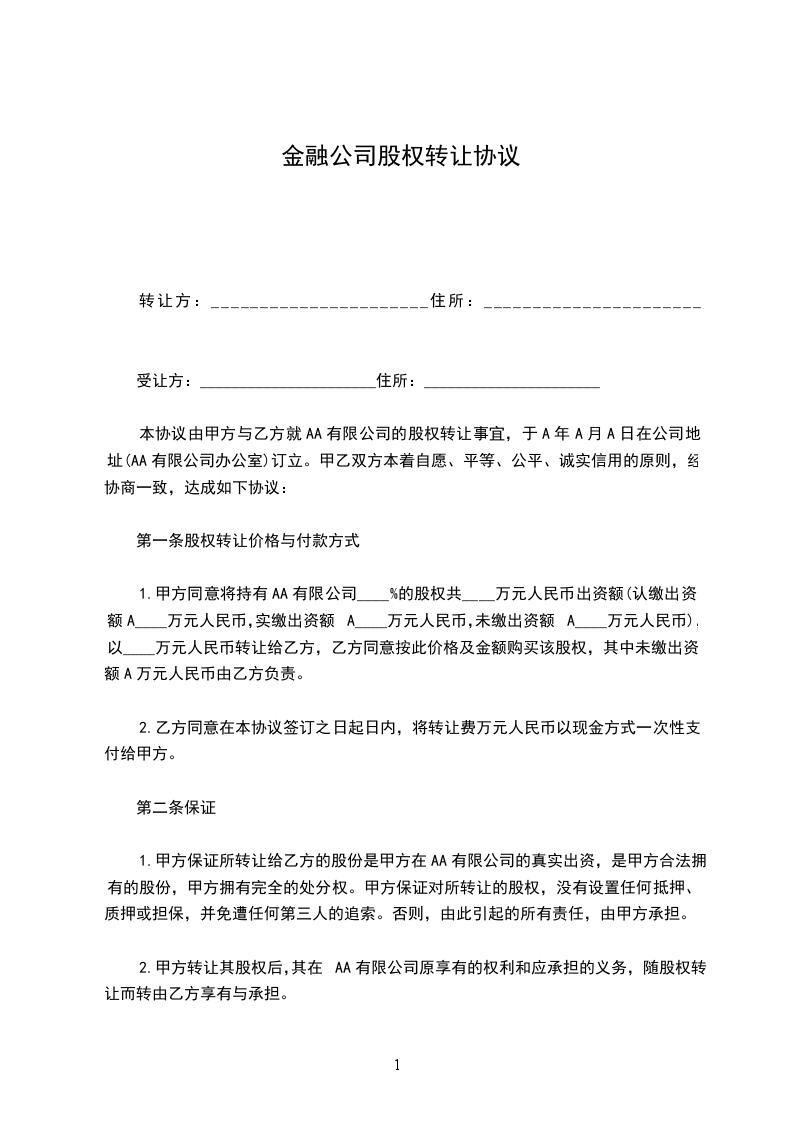 1.甲方同意将持有AA有限公司____%的股权共____万元人民币出资额(认缴出资额A____万元人民币,实缴出资额A____万元人民币,未缴出资额A____万元人民币),以____万元人民币转让给乙方,乙方同意按此价格及金额购买该股权,其中未缴出资额A万元人民币由乙方负责。
